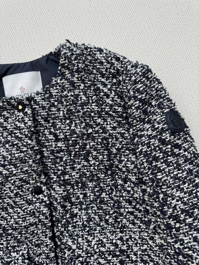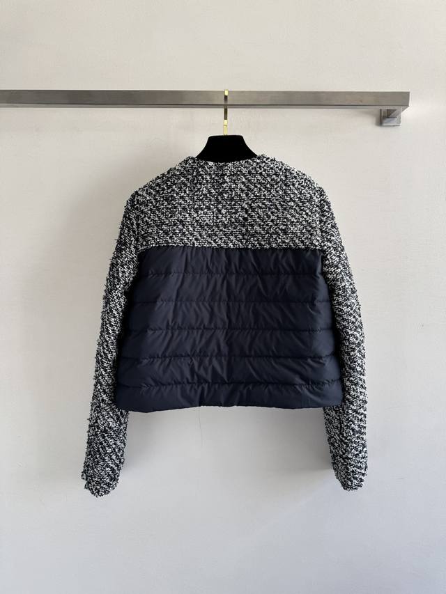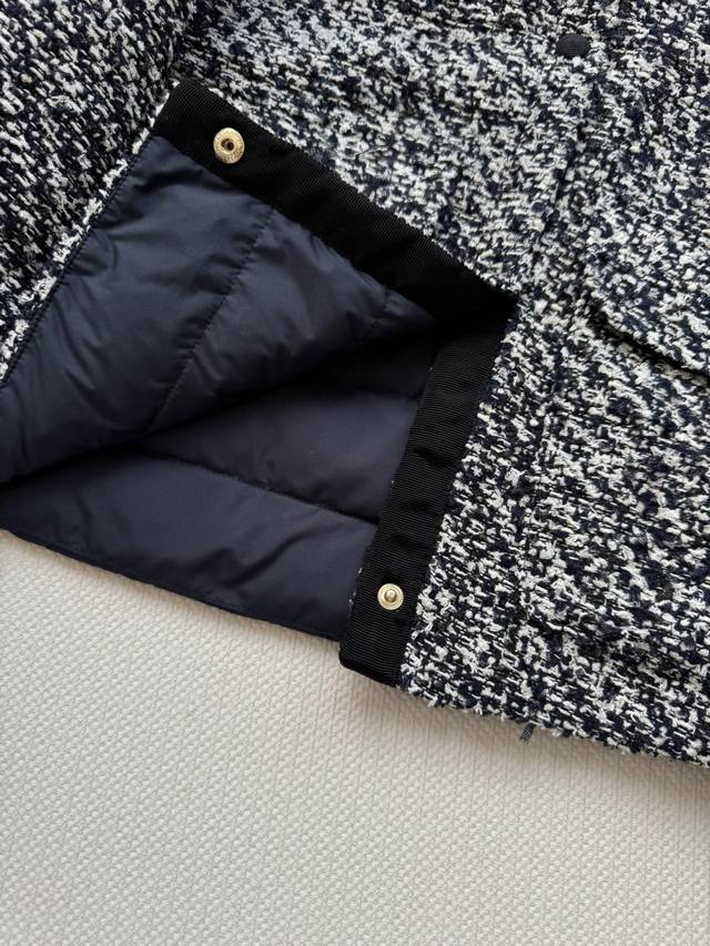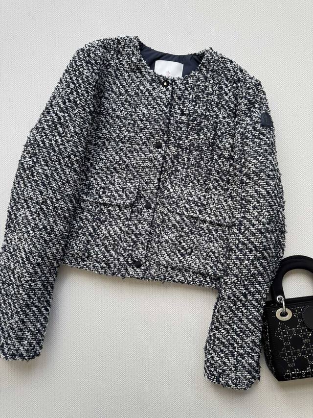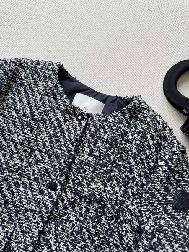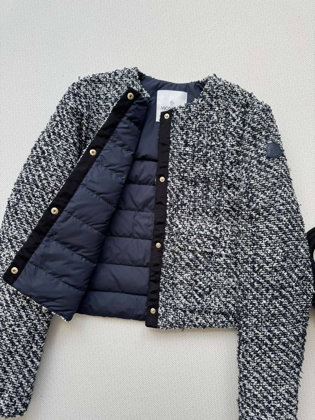 Moncle* 25Fw's new tweed fabric patchwork down jacket is a stylish and trendy design. This short, stand-up collared, Chanel-inspired woven down jacket features a contrasting symbiosis of Chanel-inspired woven fabric and lightweight cloud velvet. This elegant winter core aesthetic combines woven romanticism with futuristic functionality in a lightweight, luxurious silhouette. Sml-