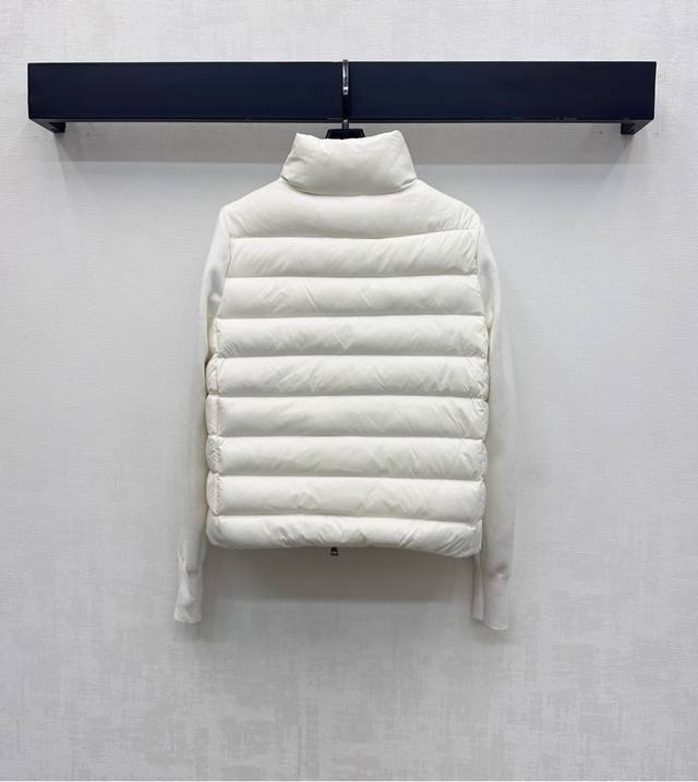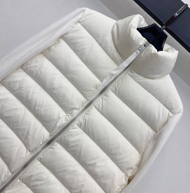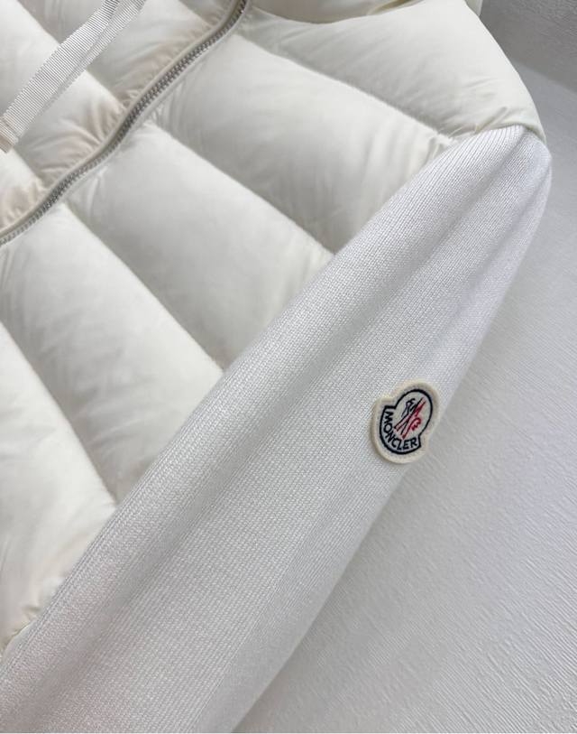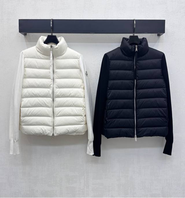 Moncle*2025 New Arrival: Patchwork Zipper Down Jacket, Custom Made with Imported Nylon and Wool, Filled with White Goose Down. Lightweight and Warm. Classic rectangular stripe embossing on the torso, combined with knitted patchwork design on the arms for added style and layering. The outer sleeves are adorned with a signature patch logo, showcasing the brand's character. Features include a stand-up collar, zipper, and a tailored cut. The understated yet sophisticated details successfully break away from dullness, combining warmth and style. Filling Standard: National Standard 90% Down. Filling Material: White Goose Down. High-Version, 2 Colors.