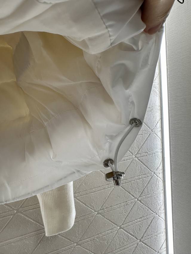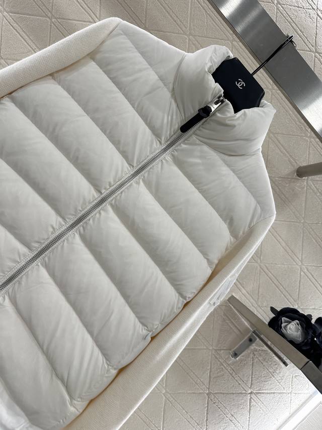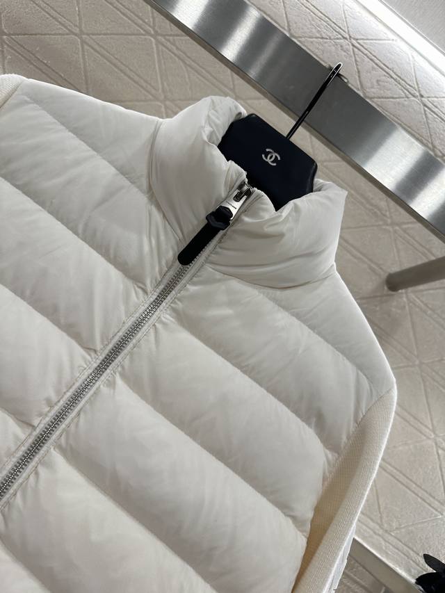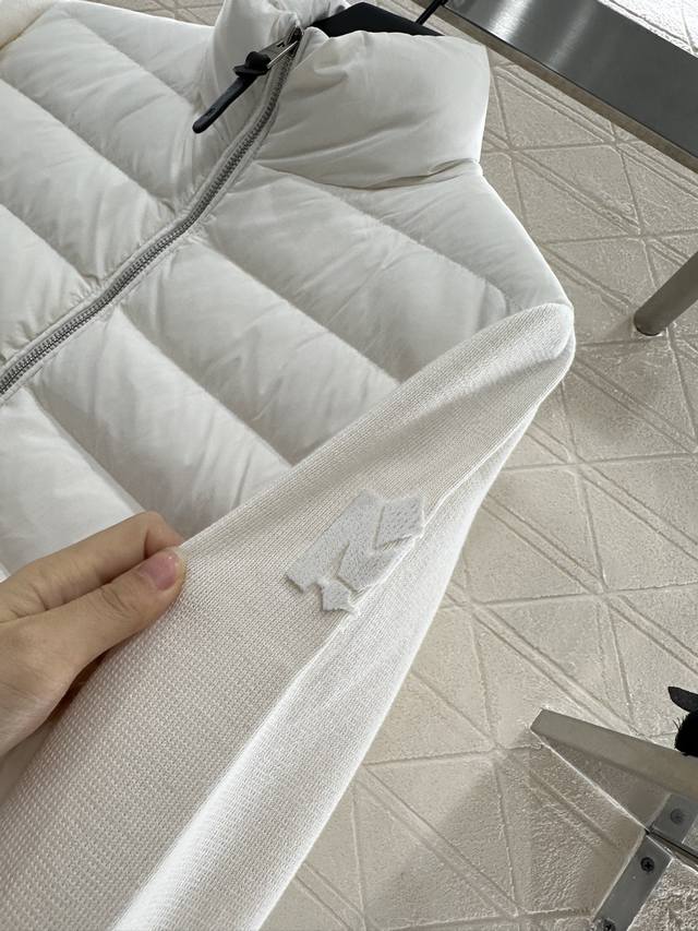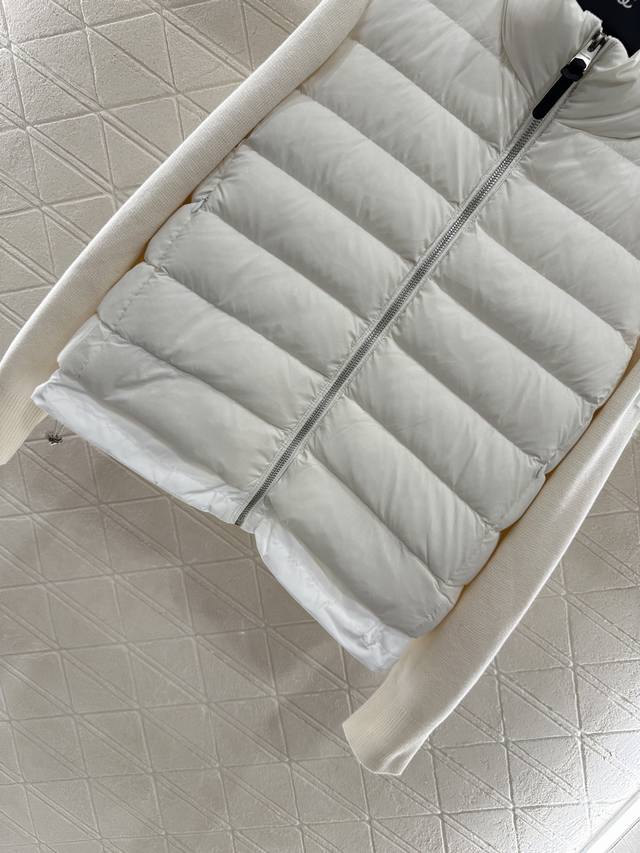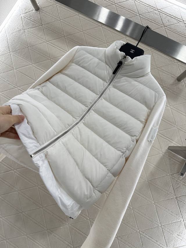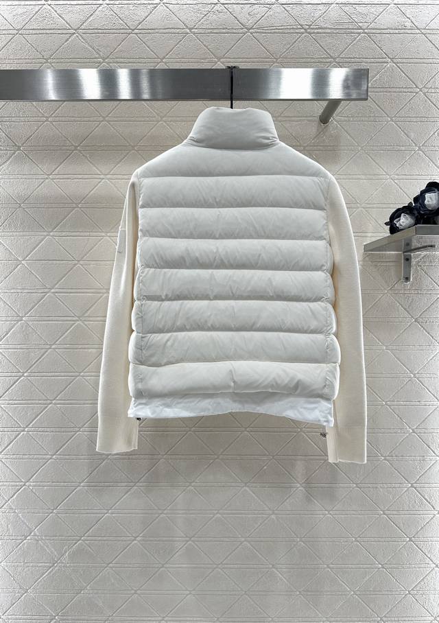 Spliced Zipper Down Jacket. Made from imported Yb nylon and wool, the craftsmanship is refined and upgraded. The material boasts a plush texture and nylon's waterproof, windproof, and cold-weather protection. Lined with white goose down, the jacket is lightweight and warm. Zippered, stand-up collar. Classic rectangular stripe embossing on the torso allows for versatile styling. Knitted arms and collar echo the collar, while signature logo patches on the sleeves enhance the understated elegance. Exquisite details elevate the look, combining warmth and style. Custom-made fabrics and accessories. Check the version. Filling standard: National Standard 90% down. Filling material: White goose down, high-quality, in three colors.