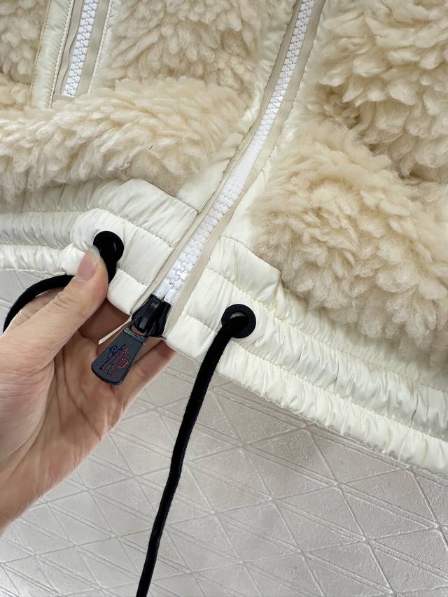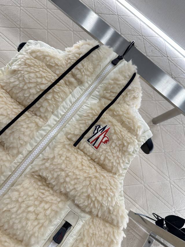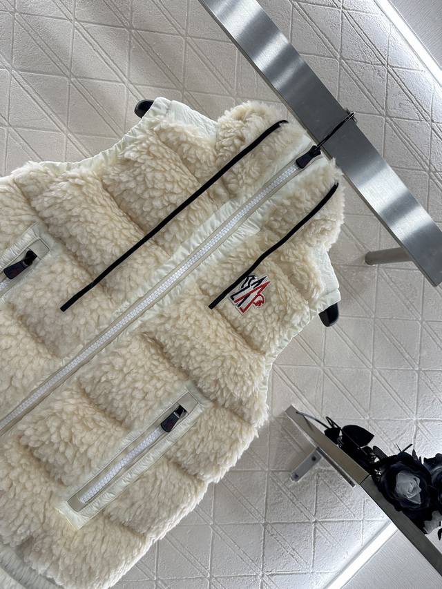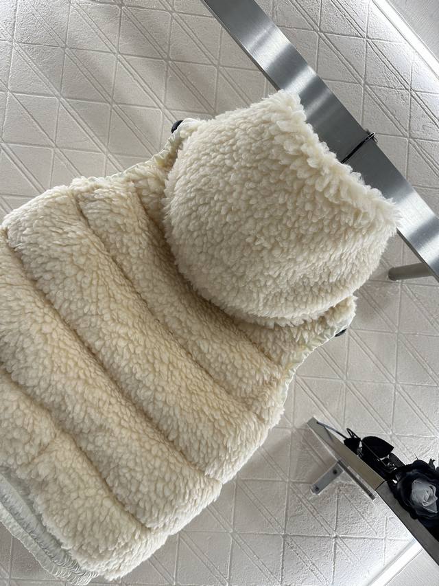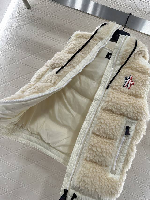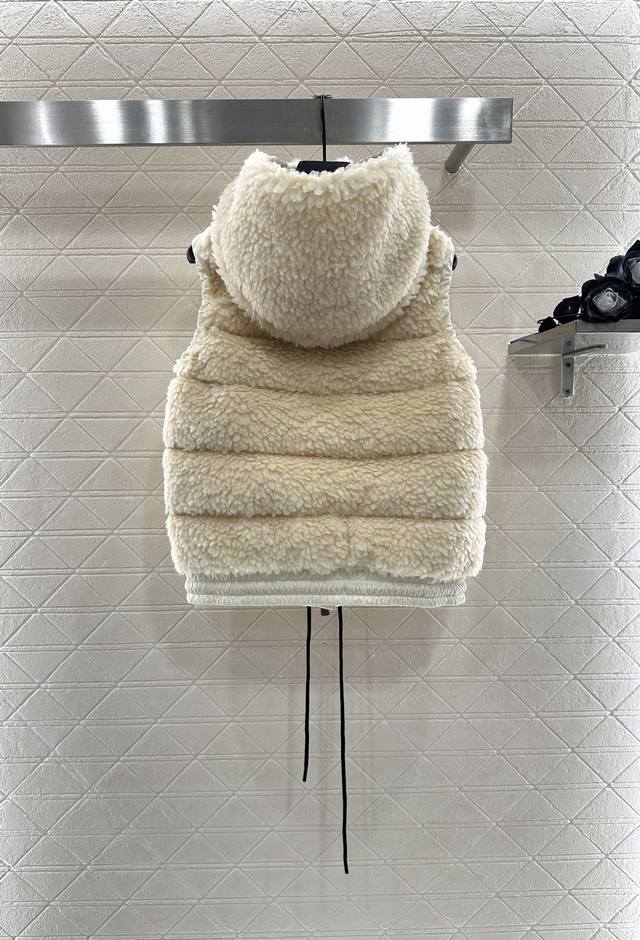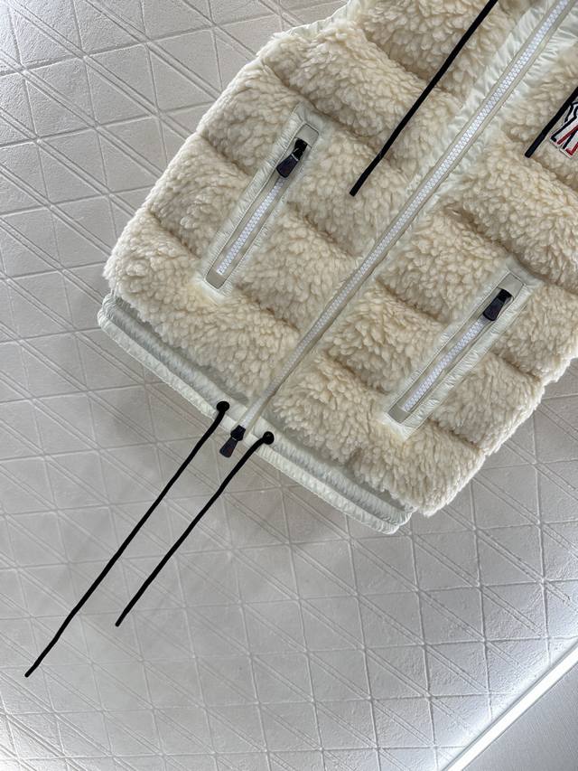 Teddy Plush Zipper Down Vest. The outer layer is adorned with a soft, comfortable, three-dimensional, fluffy Teddy plush. The hooded, drawstring zippered vest features a stylish, fashionable silhouette with nylon edging. The exposed chest badge showcases the brand's character. The silhouette adjusts to the body, creating a straight, slim fit with a furry feel. Zipper pockets and elastic bands enhance on/off convenience and practicality, offering a stylish and fashionable look. A top choice for fall and winter warmth. Filling: White goose down. Filling volume: National Standard 90%. Customizable fabrics and accessories. Look for the highest version available in four colors: 1, 2, and 3.