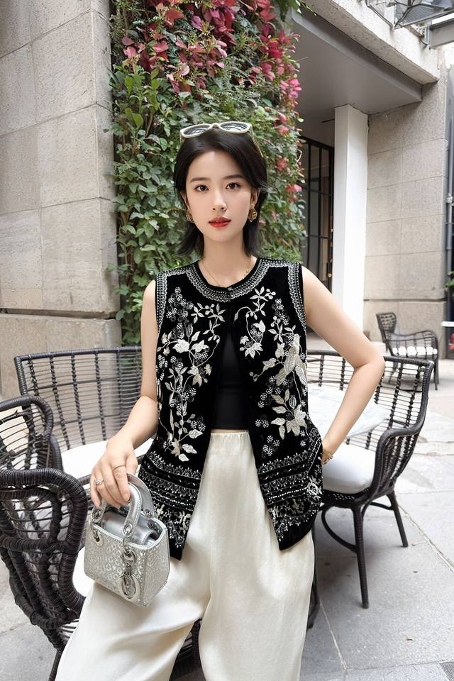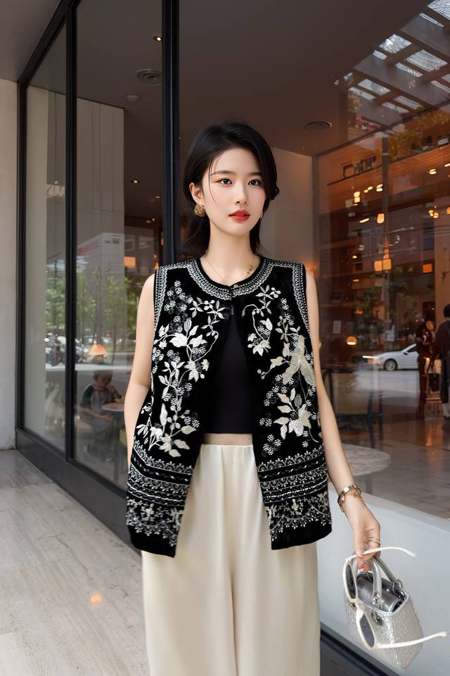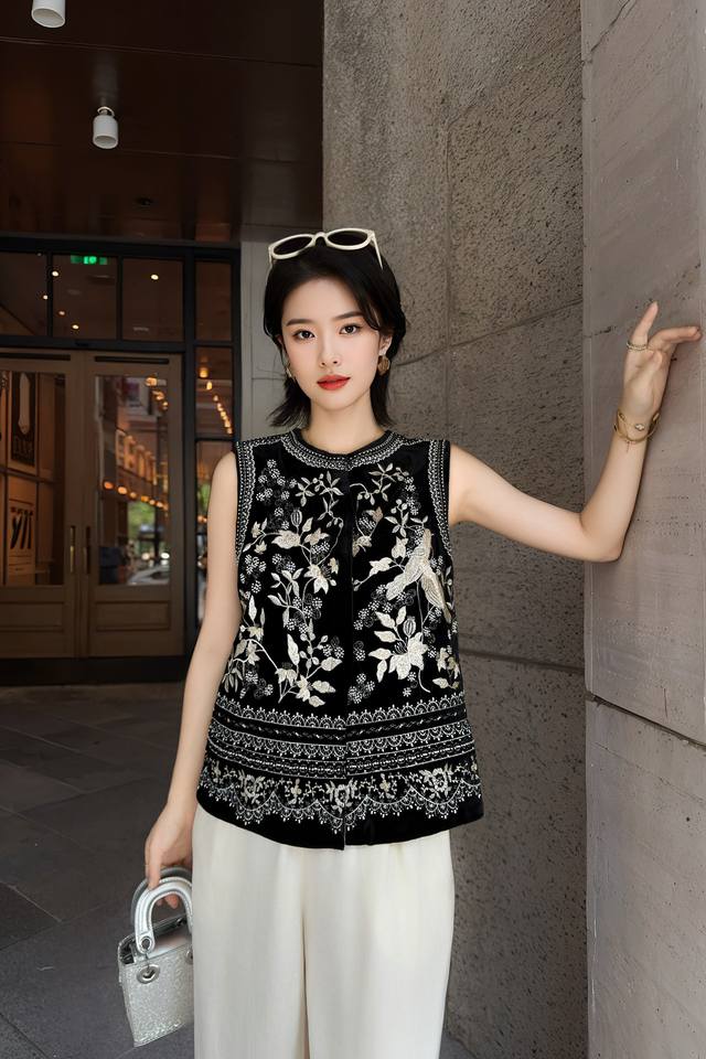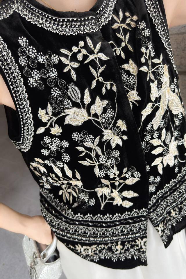 New arrival: Birdsong and Flowers, heavily embroidered silk velvet cardigan vest. Sizes S-XXL. 2 colors: black, apricot