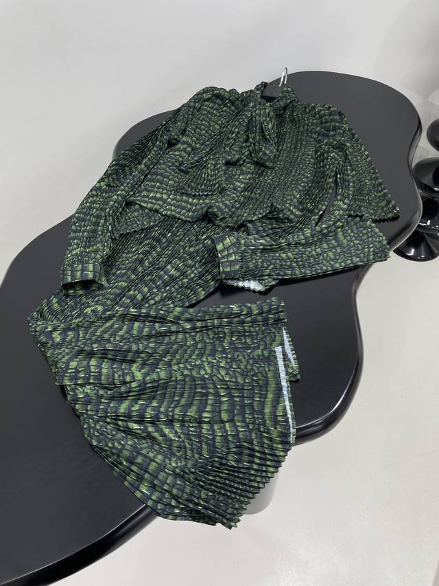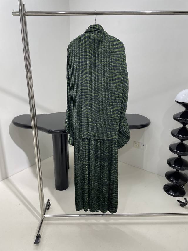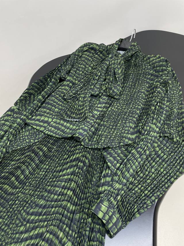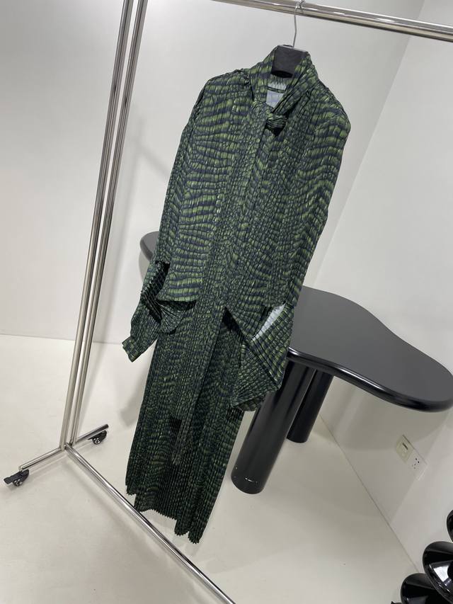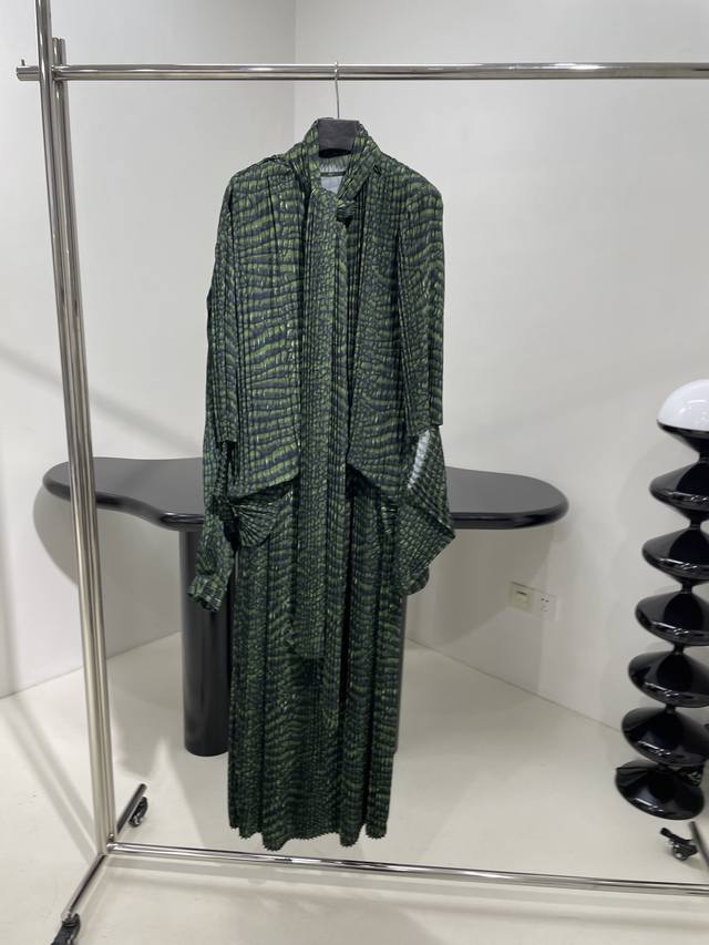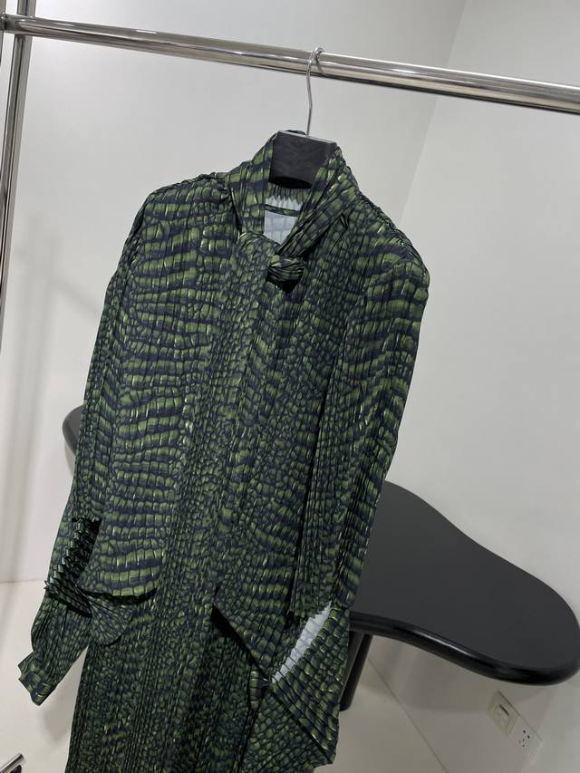 New Arrival: Cocoon Green Ai Croc Silk Satin Pleated Dress. Features include: Cocoon Green Ai Croc Silk Satin Lining; Draped Design; Two long decorative pieces at the collar that can be tied into a knot or left to hang naturally; Long sleeves with cutouts; Ankle-length; Loose Fit; Unisex; Runway Style; Crocodile Green.