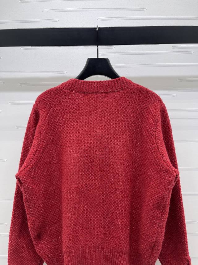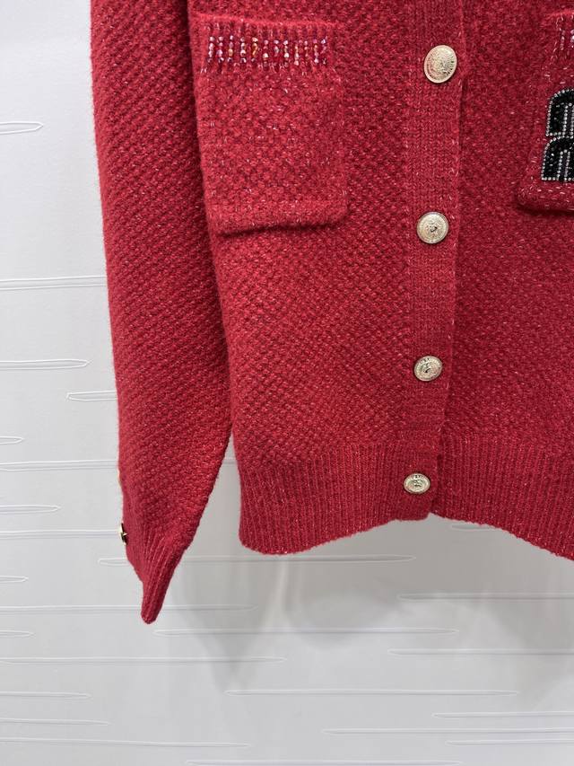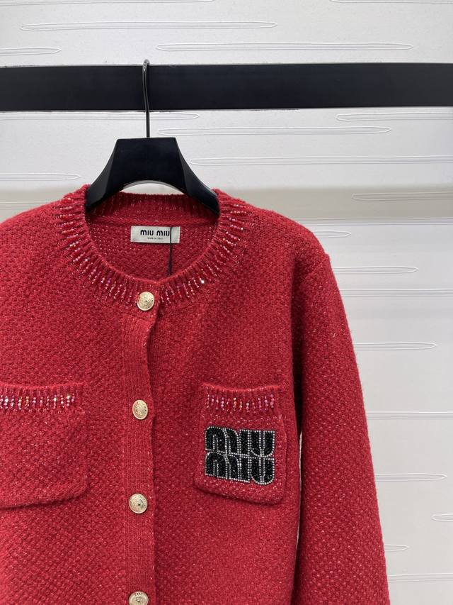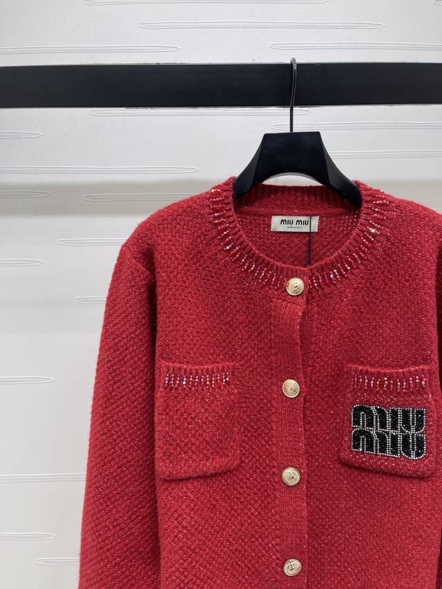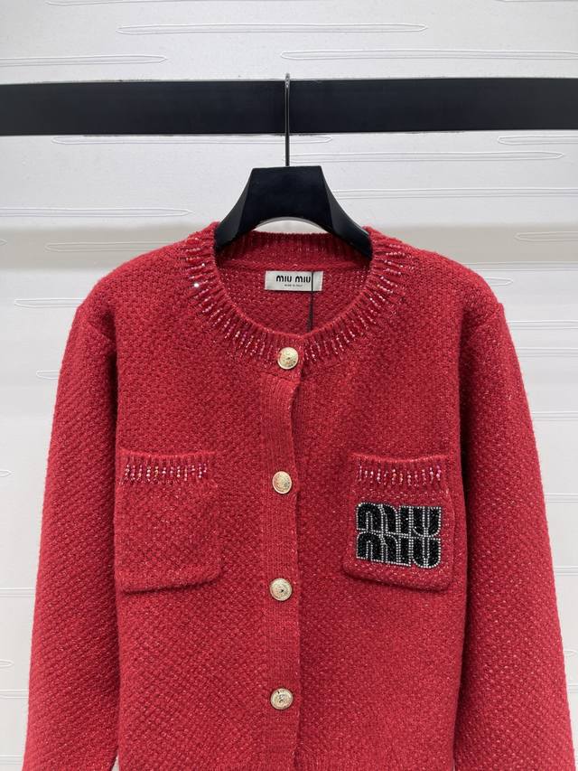 New Arrival: High-end Original Miumi* 2025 Autumn/Winter Collection! This red knit cardigan features a round neck and gold buttons, exuding a retro and sophisticated feel. It has two practical pockets on the front, and the rhinestone letter badge is eye-catching