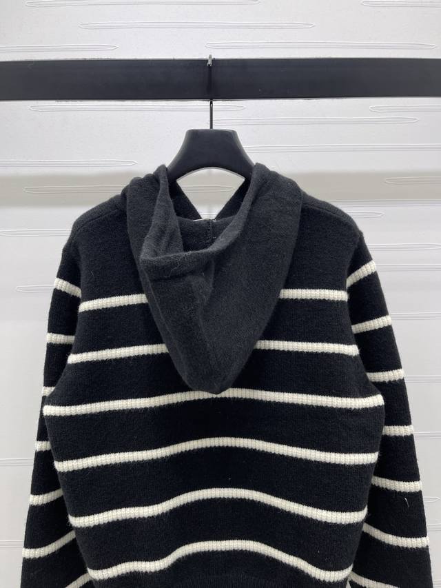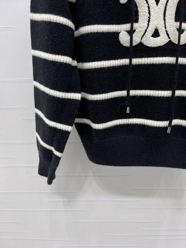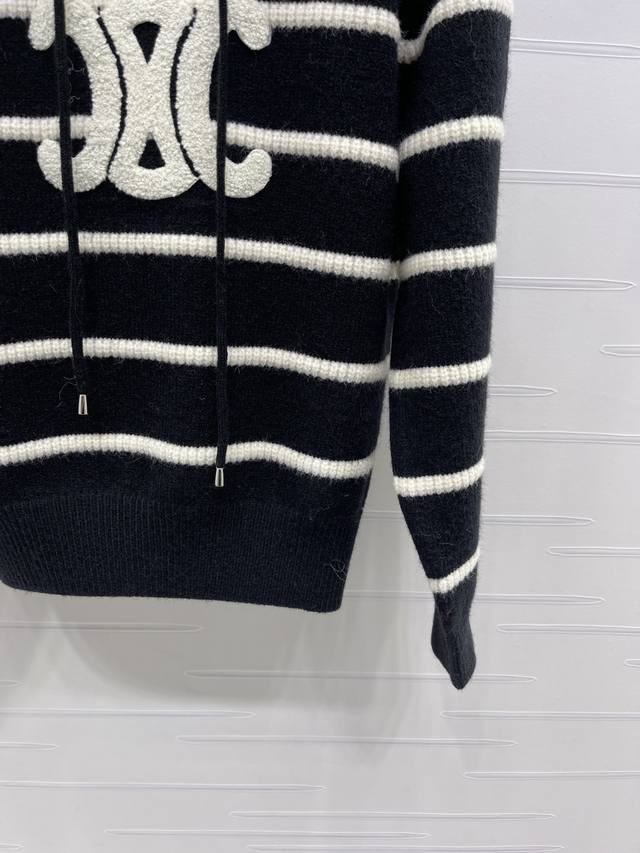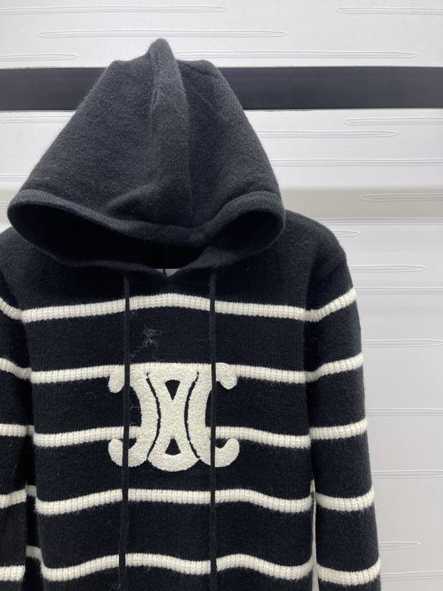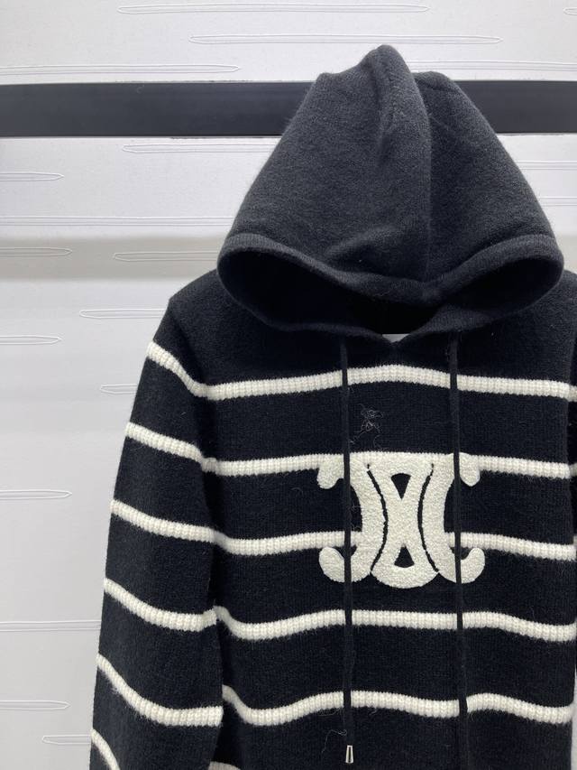 New Arrival! High-end original quality Celin 2025 Autumn/Winter latest collection! Hooded striped knit sweater! Custom wool knit material, high-quality texture, clear wool feel. Hooded long-sleeved sweater with a dense knit cut, warm and windproof. The striped design throughout and the Arc de Triomphe pattern on the chest highlight its high-end positioning and fashionable style, easily creating a relaxed and sophisticated look! 2 colors! Sizes SM-L3! High-quality bulk goods A706B410C DDD