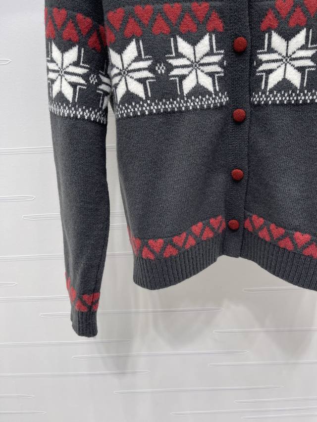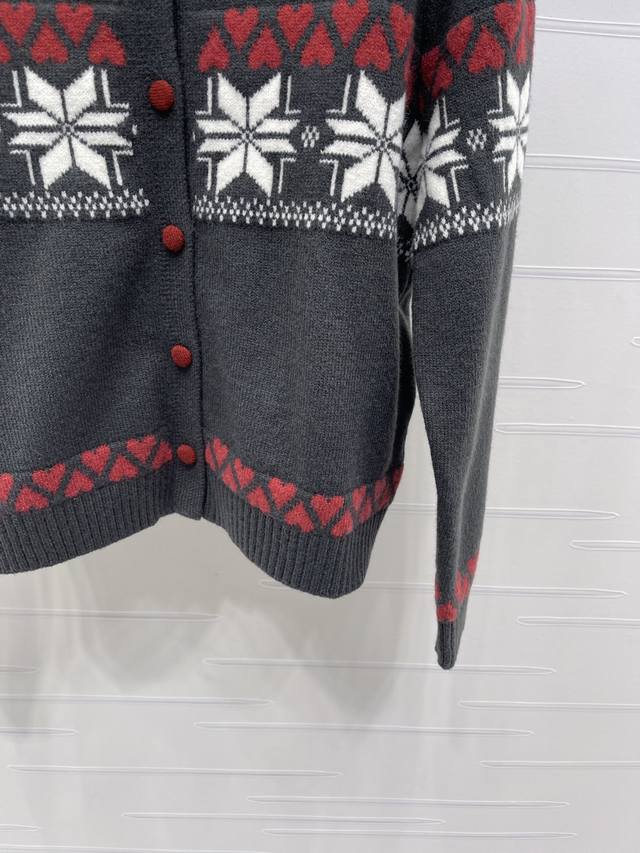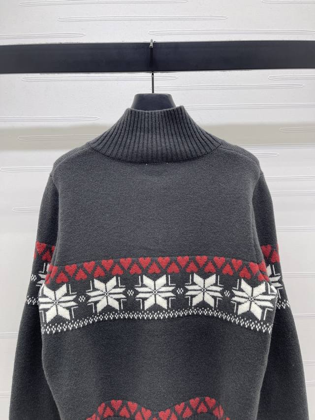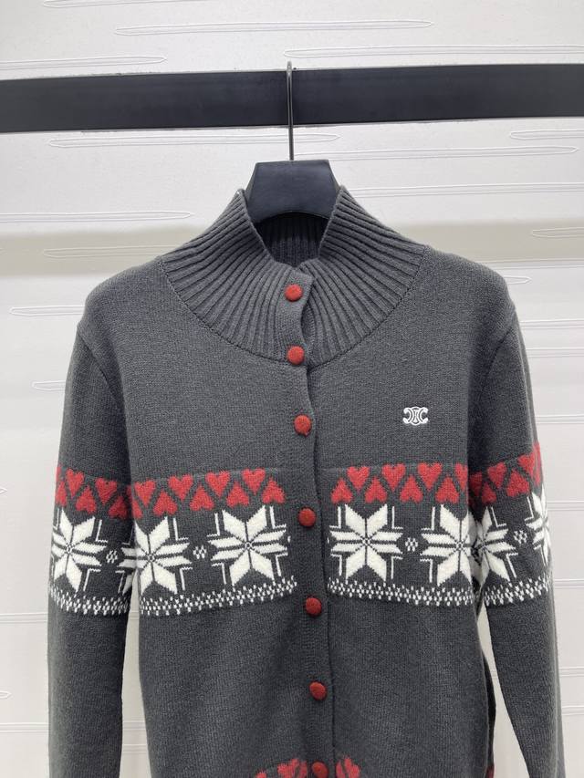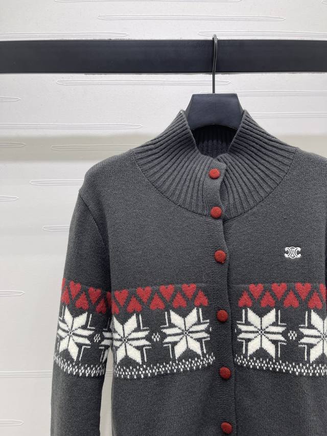 New Arrival! High-Quality Original Celin 2025 Autumn/Winter Collection! Heart-Shaped Snowflake Crew Neck Long-Sleeve Cardigan! Made of custom wool knit material, soft and delicate, comfortable to the touch. Features a stand-up collar, ribbed trim throughout, and an elasticated wrap for added warmth. The iconic Arc de Triomphe logo adorns one side of the chest, showcasing the brand's style. Geometric heart crochet patterns are arranged horizontally throughout, with contrasting stripes creating a snowflake-like wintery design that enriches the visual effect and adds an artistic touch. It exudes a simple yet sophisticated and stylish look! Available in 3 colors! Sizes SM-L3! High-quality bulk order A706B340C DDD