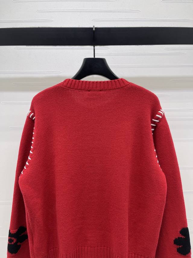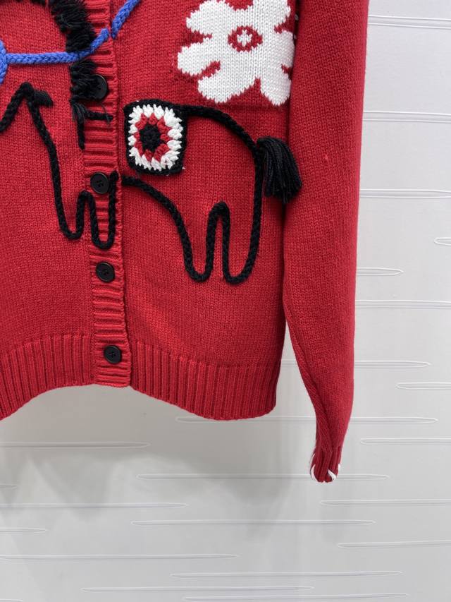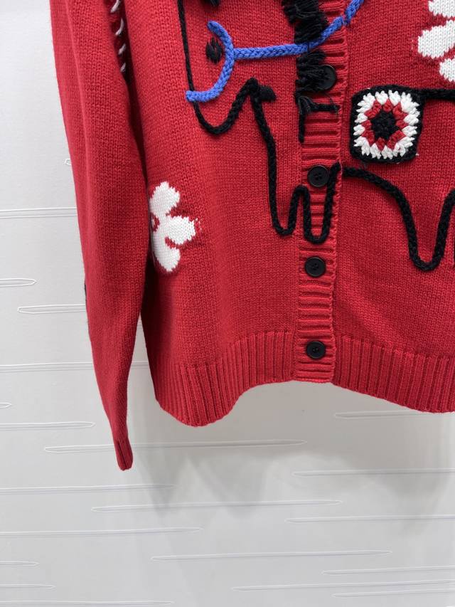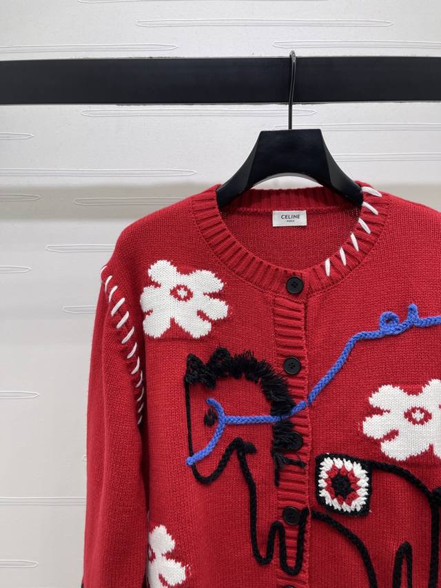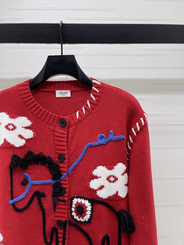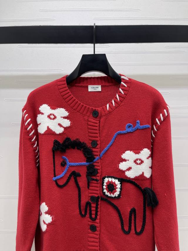 New Arrival! High-Quality Original Celin 2026 Early Spring Collection! Limited Edition Year of the Horse Color-Blocked Crochet Pony Knit Long-Sleeve Cardigan! Made with custom wool blend yarn, fine knit for a soft, comfortable, and skin-friendly feel. The round neck cardigan features a retro yet playful design. The chest is adorned with 3D pony flower crochet details and blue lines. A classic fit with a festive feel! Available in 1 color! Sizes SM-L3! High-quality bulk order A706B310C DDD
