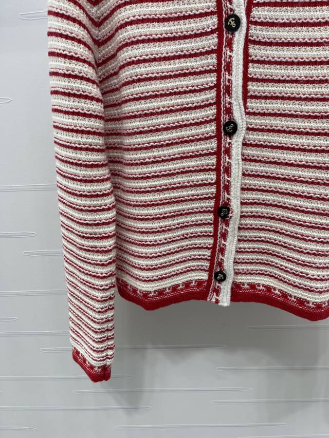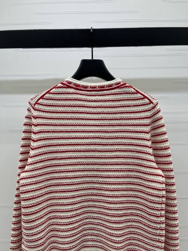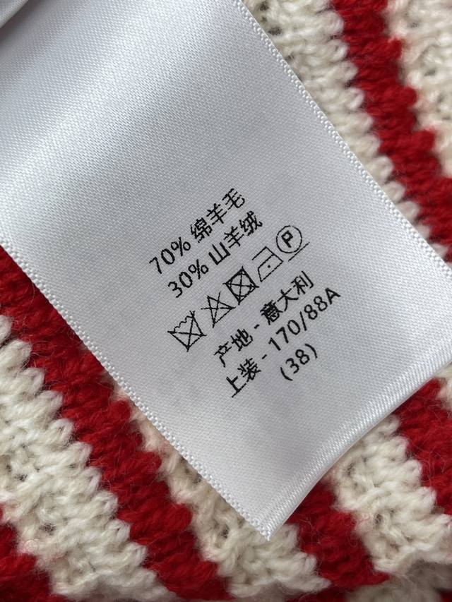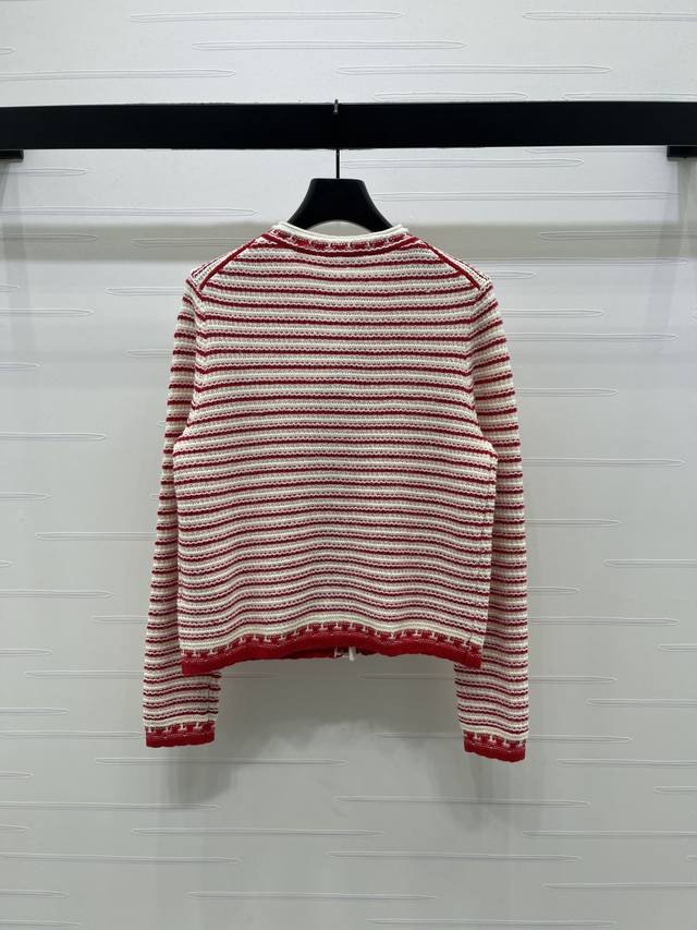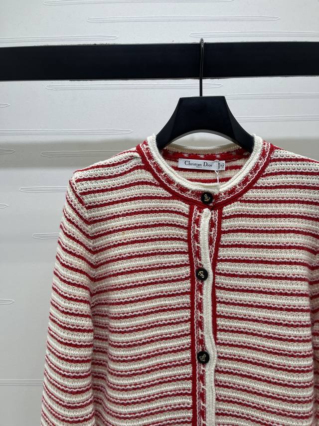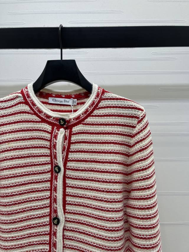 New Arrival! High-Quality Original Dio* 2025 Autumn/Winter Collection! Crew Neck Striped Knit Cardigan! Made of custom wool knit material, soft and delicate, comfortable to the touch. The crew neck design features striped details extending from the collar to the front, creating a contrasting effect. The iconic anchor button adorns the front, showcasing the brand's style. The overall design features two-tone horizontal stripes, with wide striped trim at the hem and cuffs, enriching the visual appeal and adding an artistic touch. The stretchy fabric conforms to the body, exuding a simple yet sophisticated and stylish look! 1 color! Sizes SM-L3! High-quality bulk order A706B380C DDD