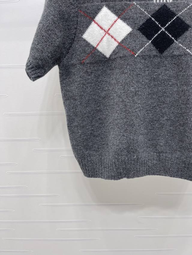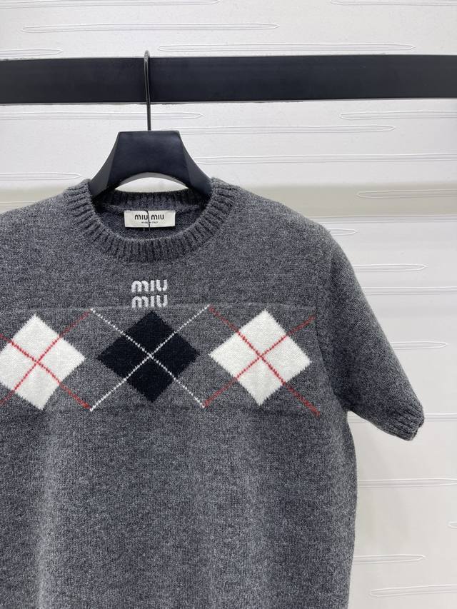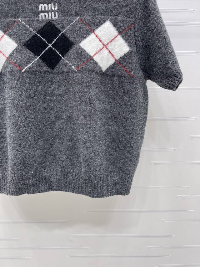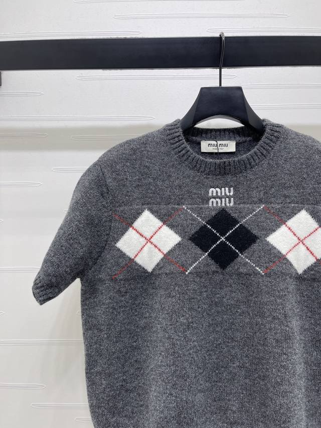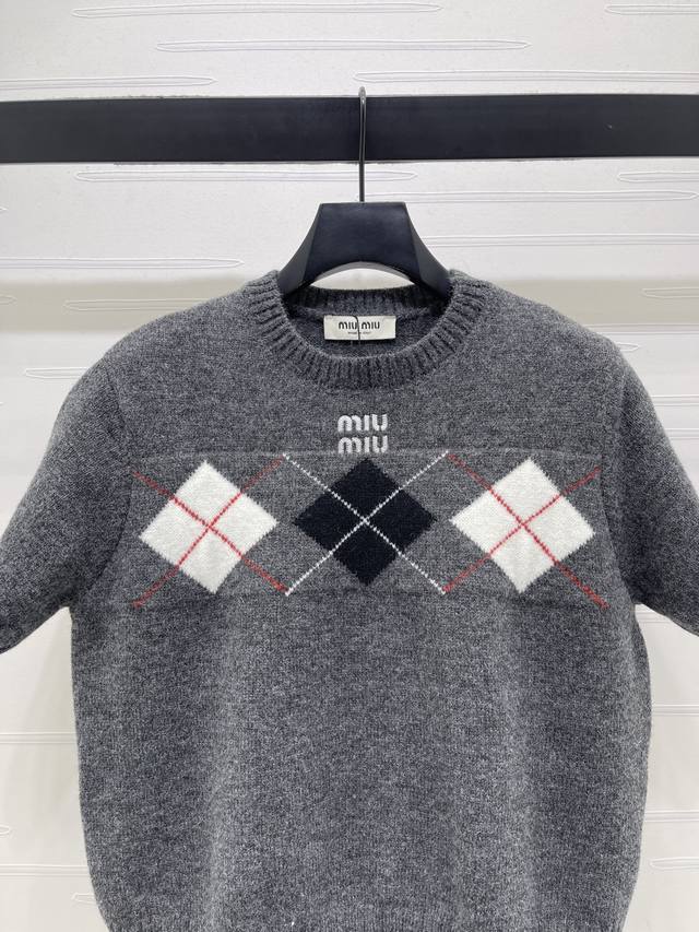New Arrival! High-quality original Miu Mi*2026 Early Spring Collection! Diamond-patterned short-sleeved sweater, classic diamond pattern + color-blocking design, full of preppy style, soft knit fabric, round neck short sleeves, bursting with festive vibes. Easily achieve a Korean retro style, perfect for everyday wear or holiday parties! 3 colors! Sizes SM-L3! High-quality bulk order A706B400C DDD