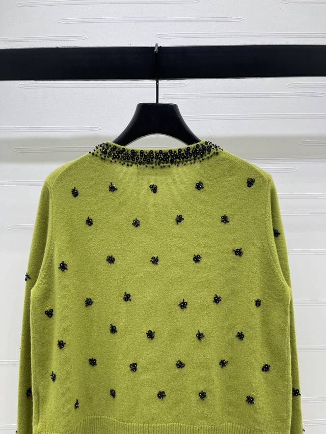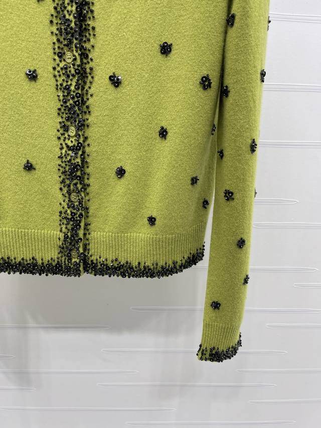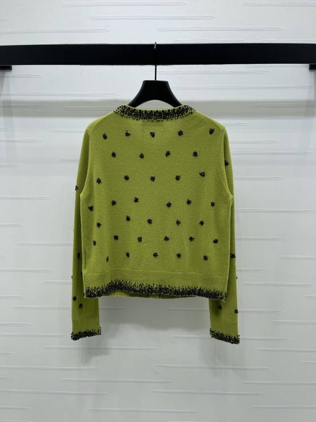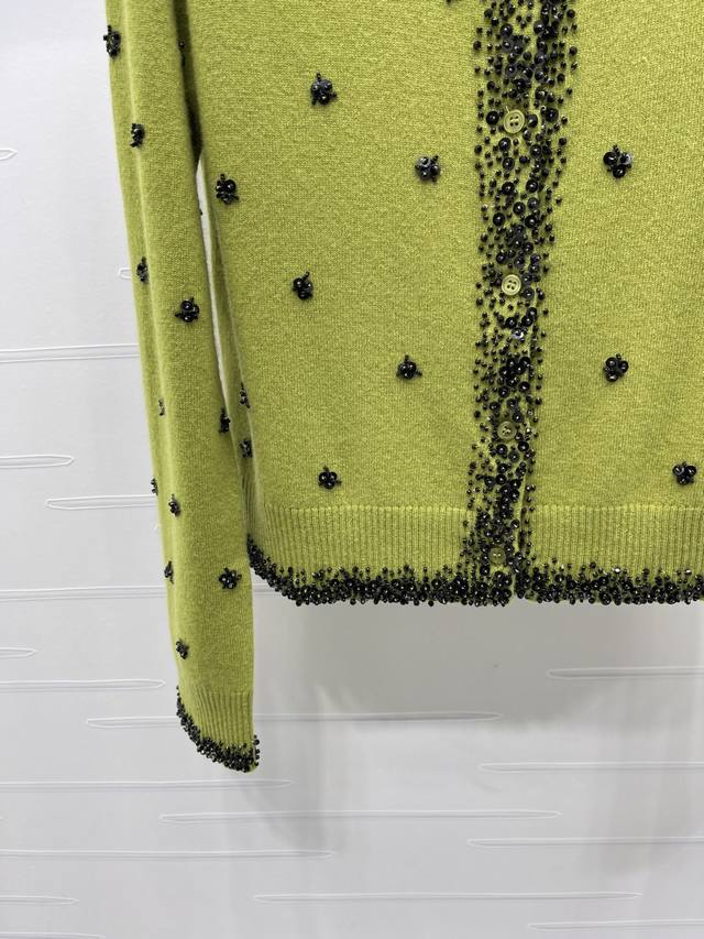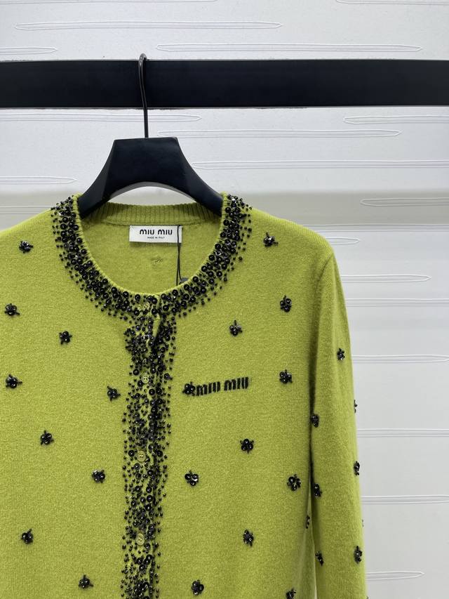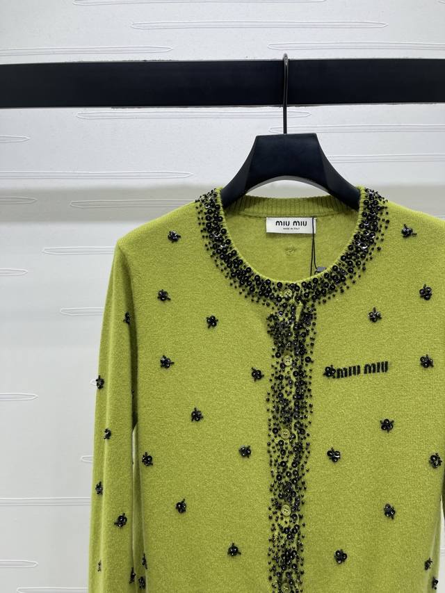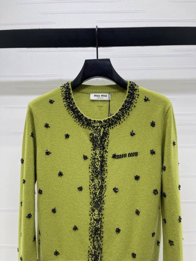 New Arrival! High-Quality Original Miumi 2025 Autumn/Winter Collection! Sequined Beaded Knit Cardigan! Crafted from custom wool yarn with a fine knit density, offering a clear wool-like texture that is comfortable and skin-friendly. Features a round neck, structured shoulders, and button-down design. A logo logo on the chest highlights the cardigan's style. The neckline extends to the front hem and cuffs, outlined with dense beading. Sequins and beads are strategically placed on both sides of the body, forming a floral pattern that reflects glamorous light, creating a luxurious and relaxed feel. Ribbed edges at the collar, cuffs, and hem provide excellent elasticity. The rich color scheme adds a sense of depth, and the flattering fit is forgiving and youthful. Available in 2 colors! Sizes SM-L3! High-quality bulk order A706B620C DDD