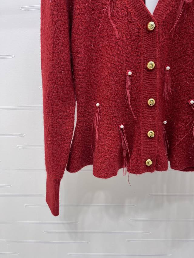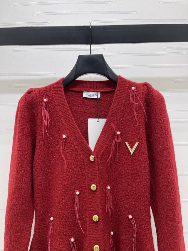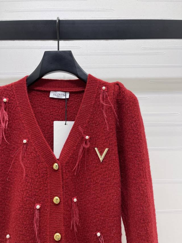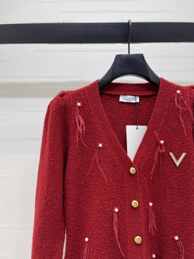 New Arrival! High-Quality Original Valentin*2026 Early Spring Collection! Pearl Beaded V-Neck Knit Cardigan! Made with custom wool blend yarn, this cardigan boasts a luxurious, delicate, soft, and comfortable texture. Features puff sleeves, a V-neck, long sleeves, a fishtail hem, and a cinched waist. Custom metal round buckle and a single-sided V-shaped metal embellishment add a touch of sophistication. The short design makes it easy to style for holidays and parties. Elegant and practical, it's a must-have versatile piece for your autumn/winter wardrobe! Available in 3 colors! Sizes SM-L3! High-quality bulk order A706B410C DDD