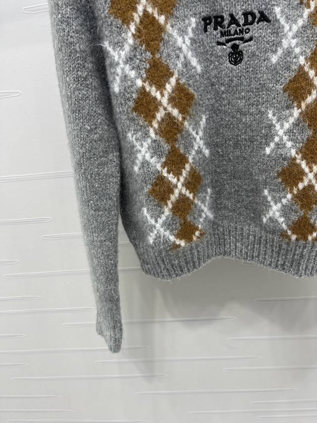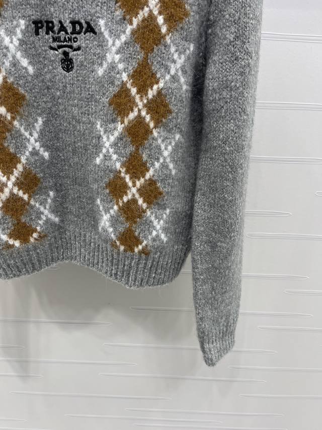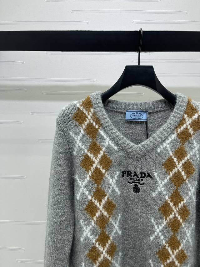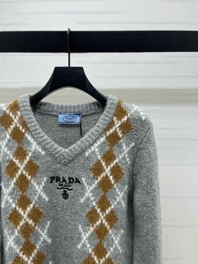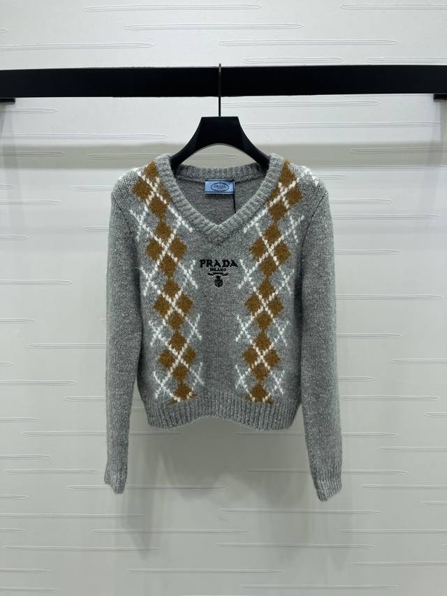 New Arrival! Original High-Quality Prad* 2025 Autumn/Winter Newest Collection! Diamond Pattern Knit Long-Sleeve V-Neck Pullover Sweater! Made with custom wool yarn, the texture is delicate and comfortable to wear. The V-neck, structured shoulder knit sweater features a multi-colored diamond pattern laid flat along the torso. Ribbed edges on the collar, cuffs, and hem provide excellent elasticity. Rich color options. Centered letter logo embroidery on the chest adds depth. The design is flattering and youthful! Available in 2 colors! Sizes SM-L3! High-quality bulk order A706B380C DDD
