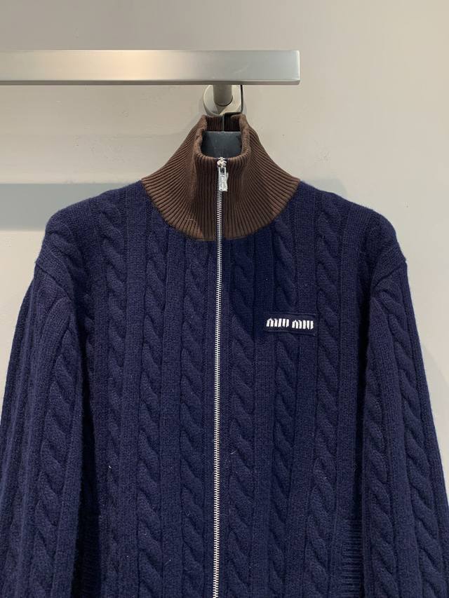 New Arrival! Piupi 2025 Autumn/Winter Retro Preppy Cable Knit Cardigan. The soft and delicate sheep's wool material is super comfortable for autumn and winter wear. The dark brown color-blocked collar, cuffs, and hem exude a retro preppy style. The full zipper design breaks the casual feel of knitwear, and the cropped silhouette raises the waistline, flattering the figure. The brand logo on the chest adds a touch of sophistication. Pair it with a turtleneck or jeans for an effortlessly stylish preppy or retro look