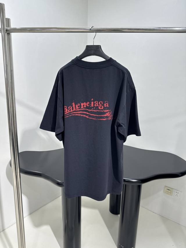 New Arrival: Political Stencil Oversized T-Shirt. Black plain knit fabric. Oversized fit. Front adorned with a Political Stencil logo tie-dye print. Distressed/distressed effect. Loose fit. Unisex. Available in blue with a new washed black finish.