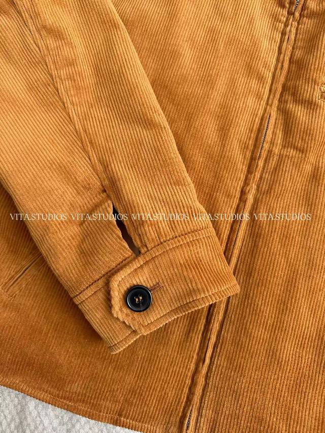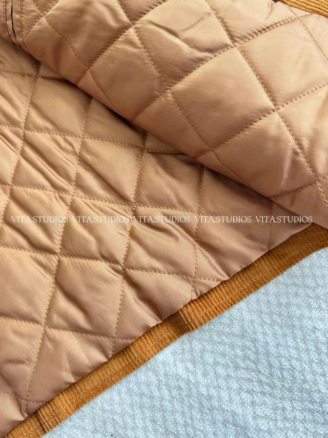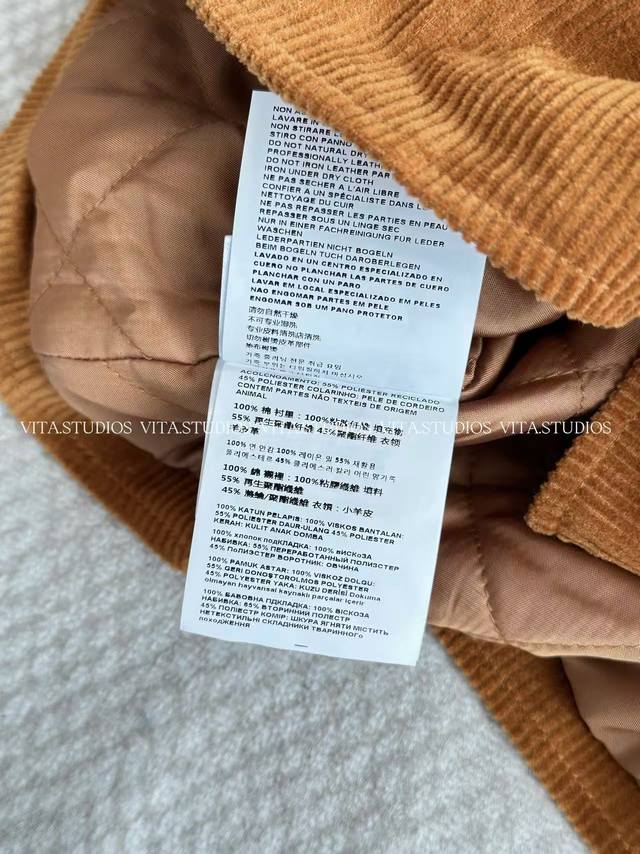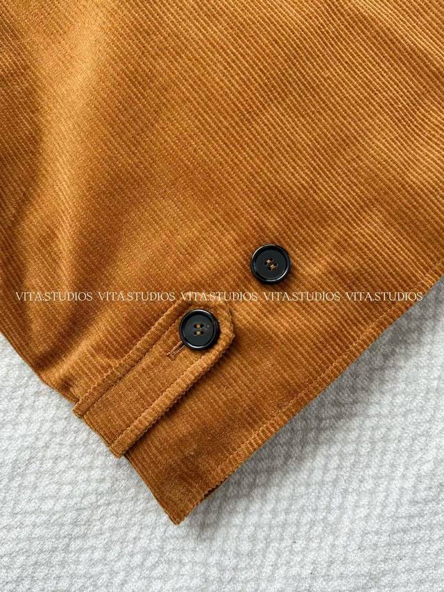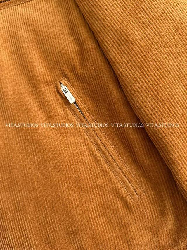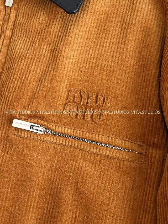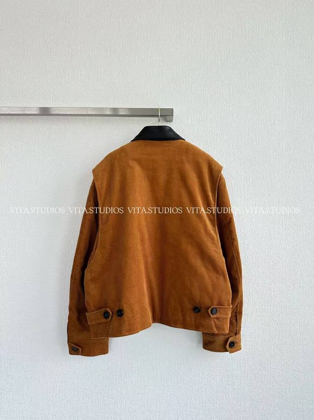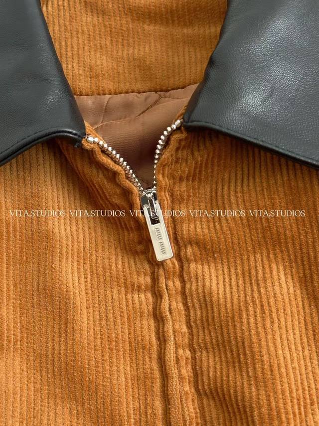 features a 100% cotton corduroy and sheepskin patchwork design in a warm, retro caramel brown hue. The delicate embroidered logo on the left chest, three hand-cut front pockets, and one hand-cut lining pocket combine practicality and craftsmanship. The custom front center zipper is smooth and easy to pull, and the black leather collar enhances the overall texture, presenting a clever fusion of elegance and workwear style.