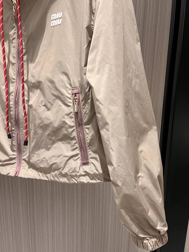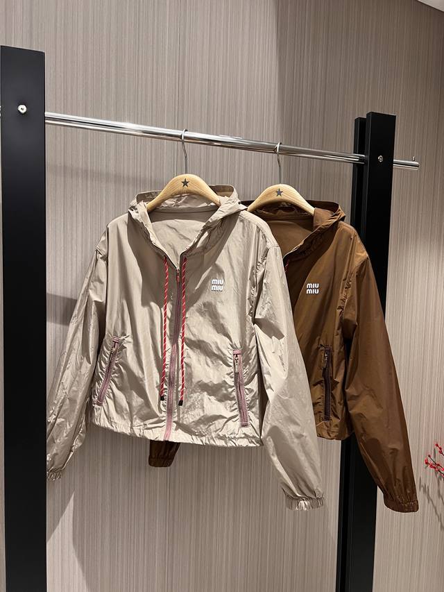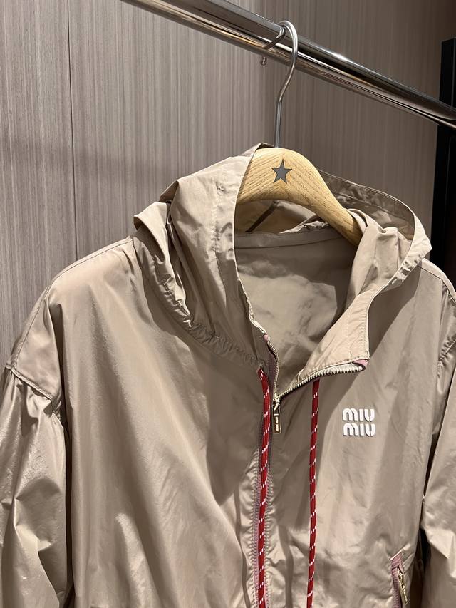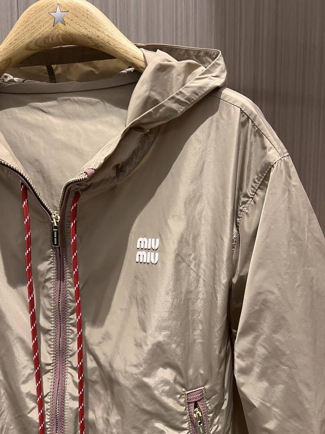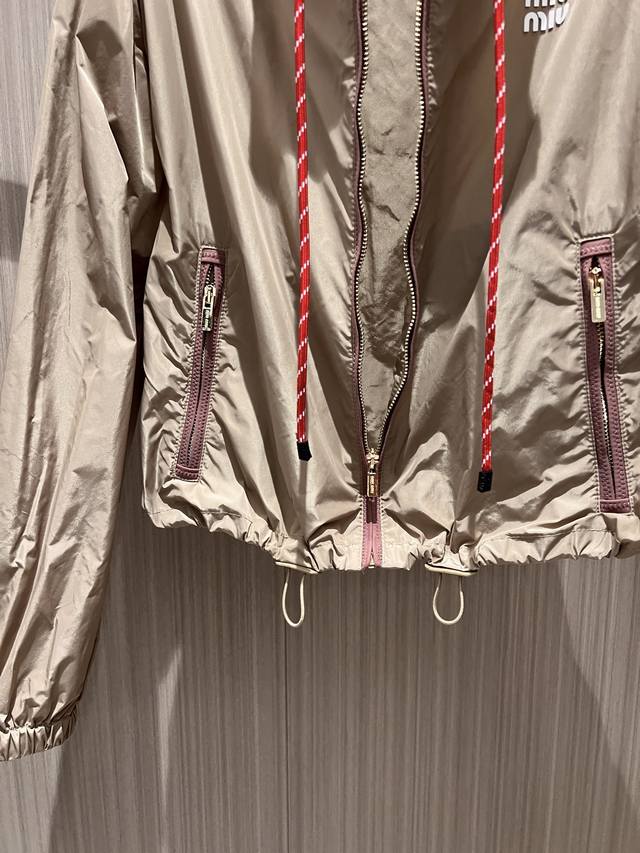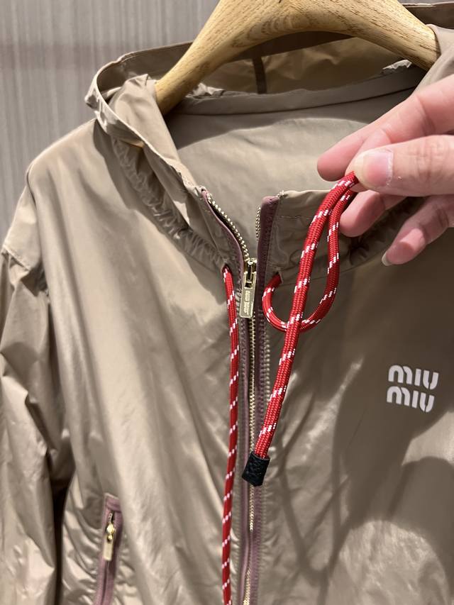 New Arrival Recommendation: Red rope-decorated hooded nylon trench coat, classic Miu style, drawstring hem, waist-cinching design, windproof, sun-protective, casual, versatile, khaki/coffee, S/ml/