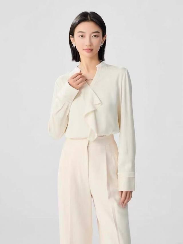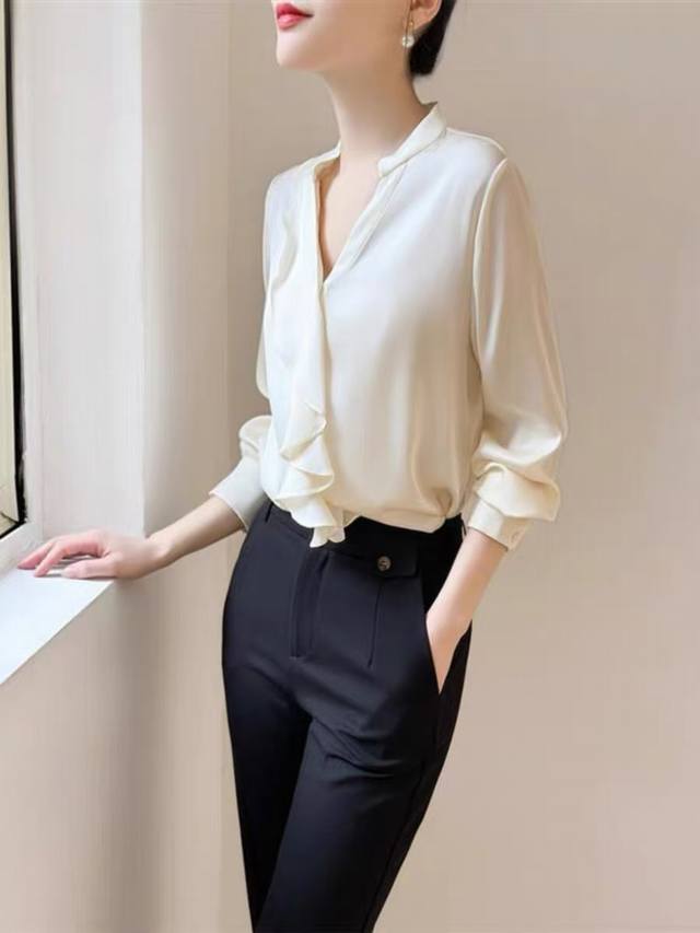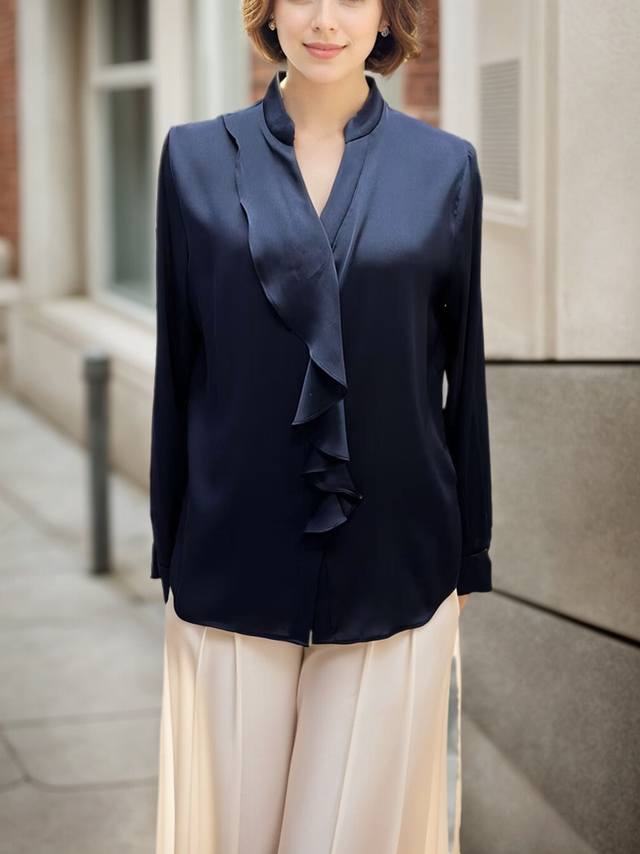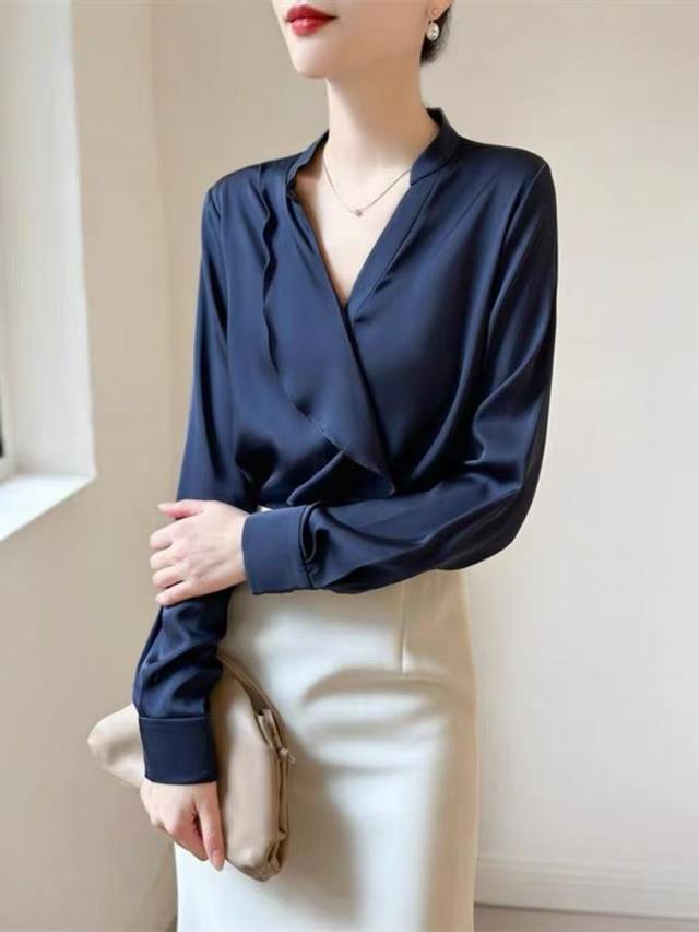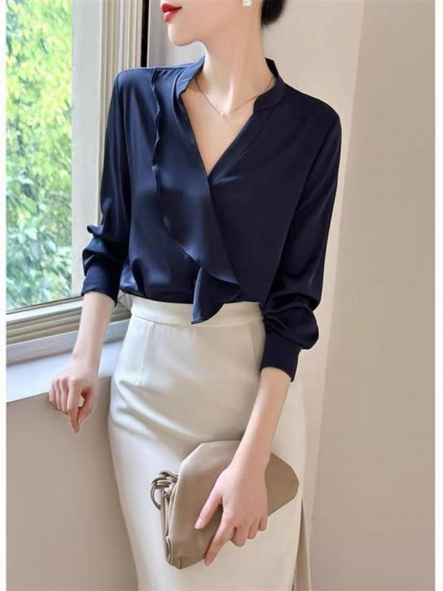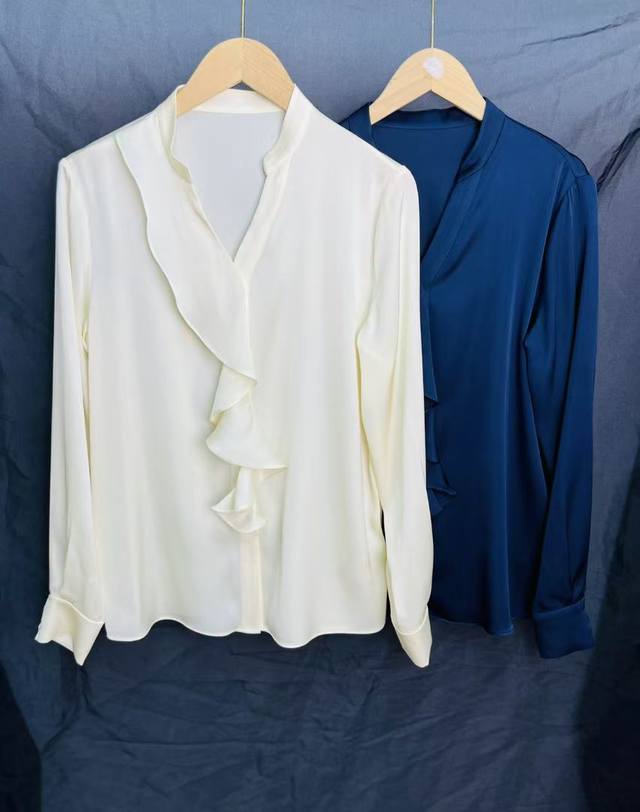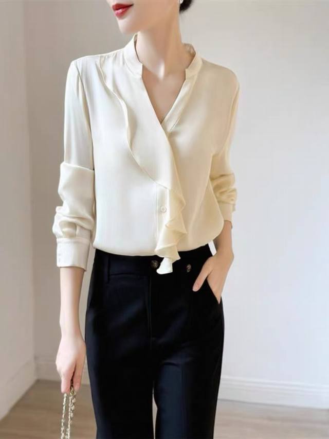 New arrival, silk double john top, elegant temperament, V-neck ruffled irregular commuter shirt, apricot, navy blue, two colors and four sizes SMLXl