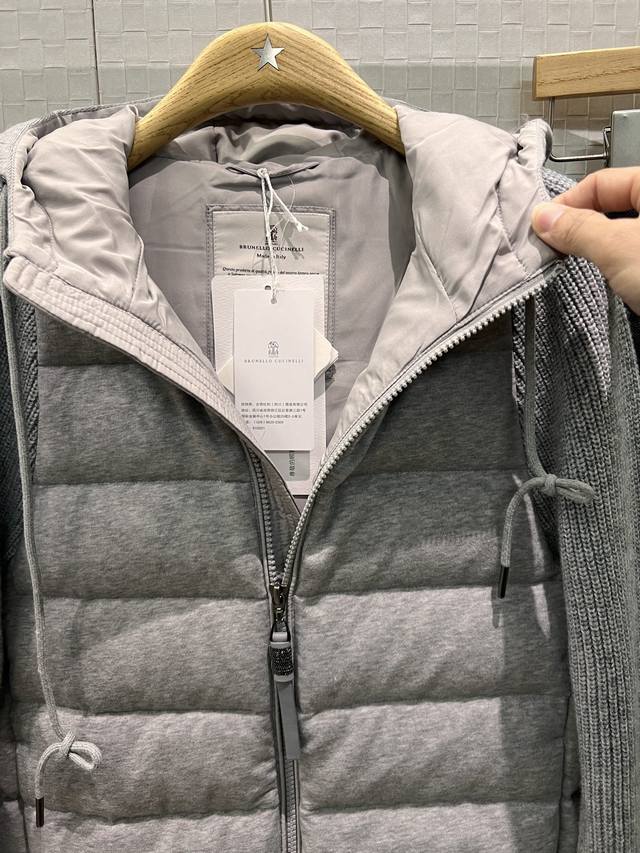 New Bc patchwork knit wool sleeve hooded down jacket, classic beaded chain zipper, 90% down, 10% feathers, comes with dust bag, grey/white, size 36-42.