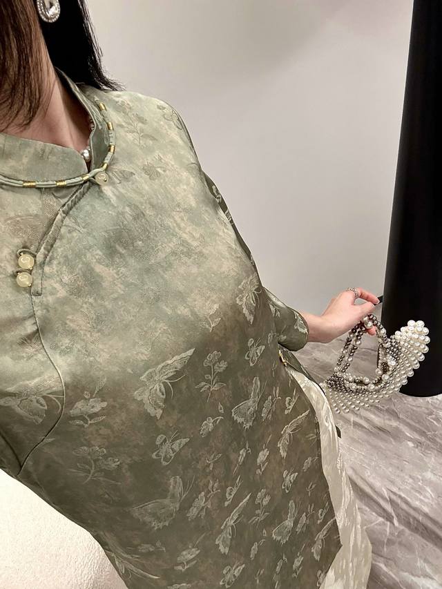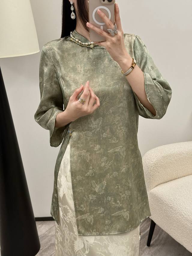 New Butterfly Silk Gold Jacquard Midi Top Gray Green Smlxl