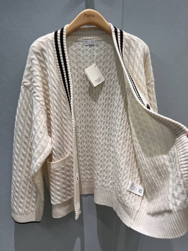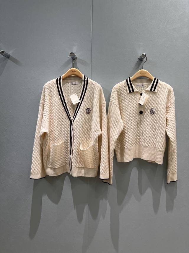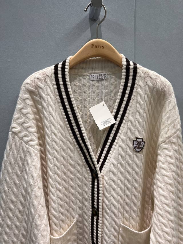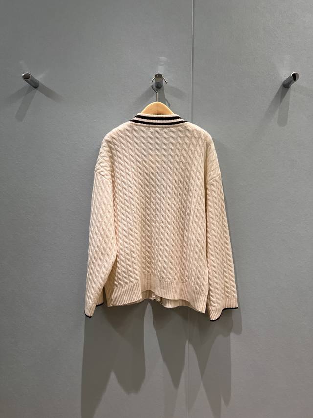 New Crane Autumn star same style Bc autumn and winter tennis college style V-neck cable knit cardigan striped collar chest logo badge decoration two side pockets loose casual age-reducing all-match Sml