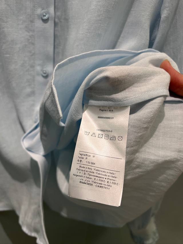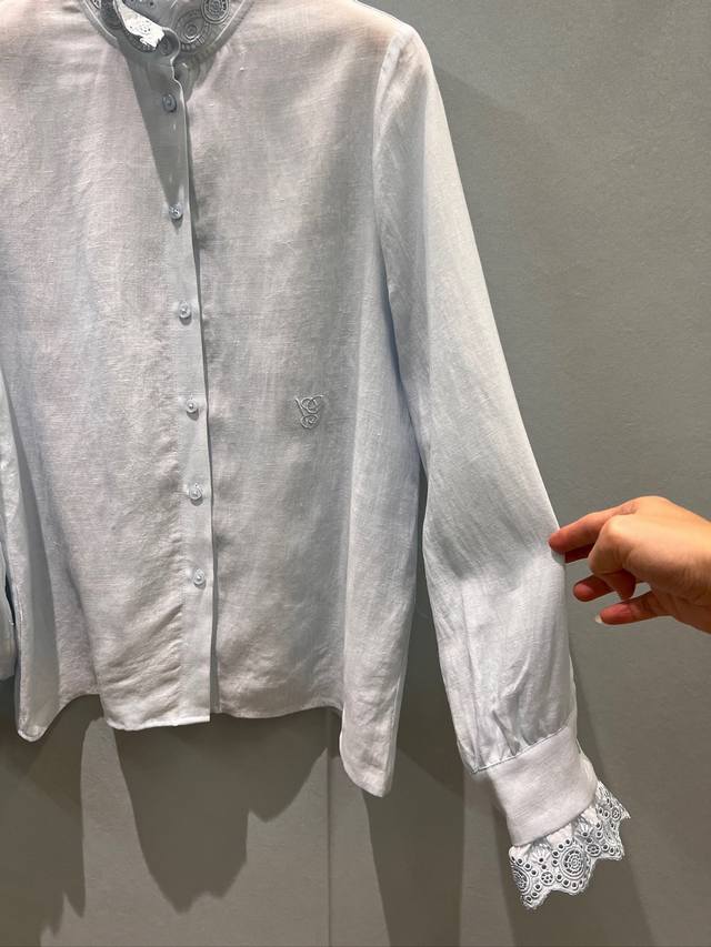New embroidered lace stand-up collar linen shirt with a striking logo trim at the hem, exuding a ladylike and versatile style suitable for commuting. Light blue/white, sizes S-XL, sizes