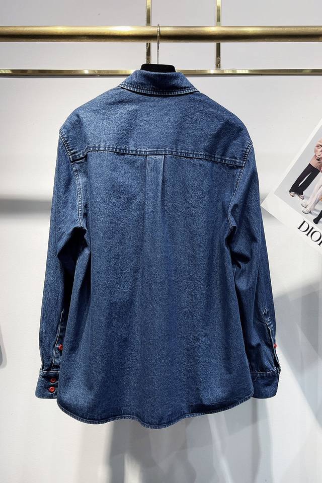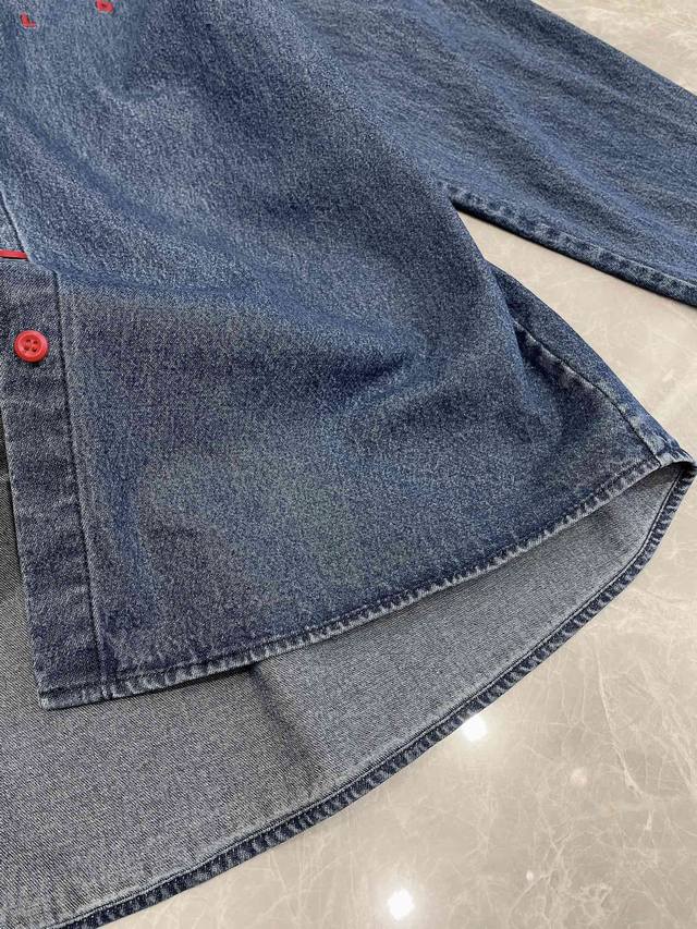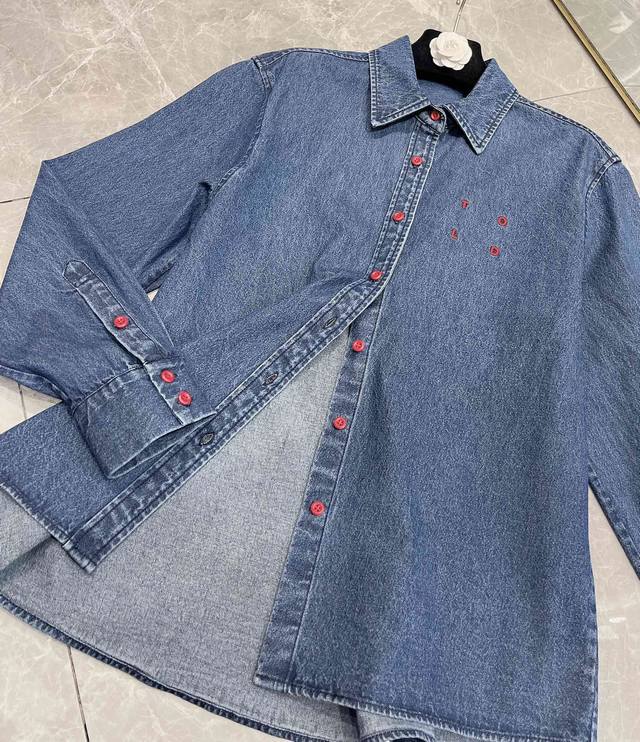 25Aw. Loew* exclusive hot-seller recommendation. High-quality vintage blue casual contrast embroidered denim shirt, perfect for all seasons. Straight-shoulder design, slightly loose fit, comfortable yet relaxed, regardless of age or body type. Exquisite French style, unique and distinctive. Embroidered design, age-reducing, retro color, flattering figure, comfortable and stylish. Looks great with dad shoes or boots. Collar flatters the neckline, framing the face for a more delicate look. Simple and elegant. Eye-catching contrasting red lettering embroidery, stylish and refined, with visually rich styling. Delicate red shell buttons add a warm detail. Slimming hem design. Fine workmanship. Layered or worn as a jacket for a unique look. Casual, fashionable, classic, age-reducing, versatile, stylish, and effortlessly sophisticated. A popular item. Color: Vintage Blue. Sizes: S-L. Exclusive in stock.