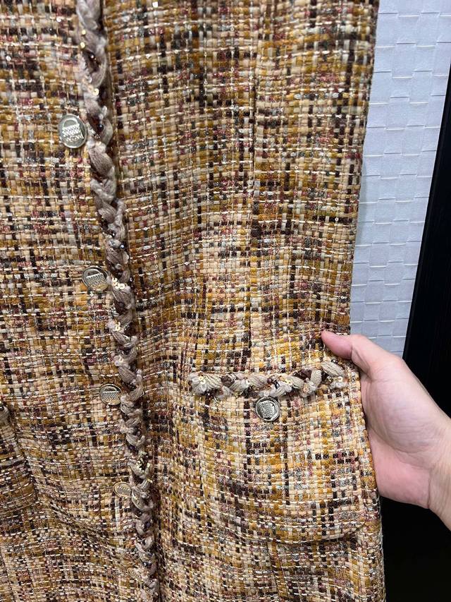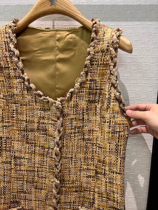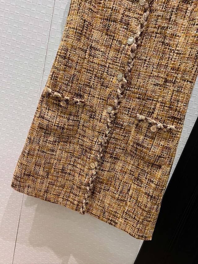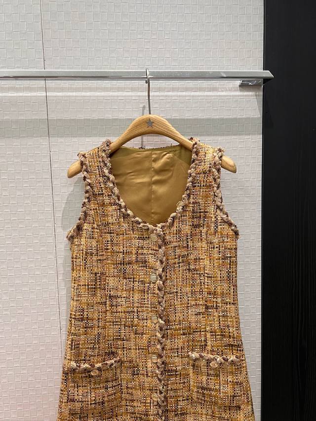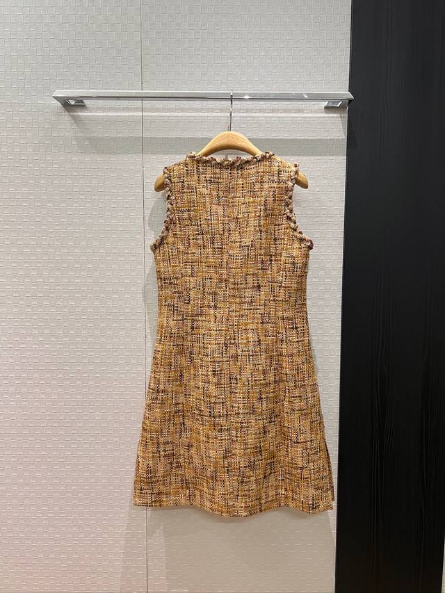 New heavy-duty woven trim tweed vest sleeveless dress with side pockets. Simple and elegant A-line silhouette, slimming and flattering for all body types. Can be paired with a matching short jacket. Sizes: S, M, D. D
