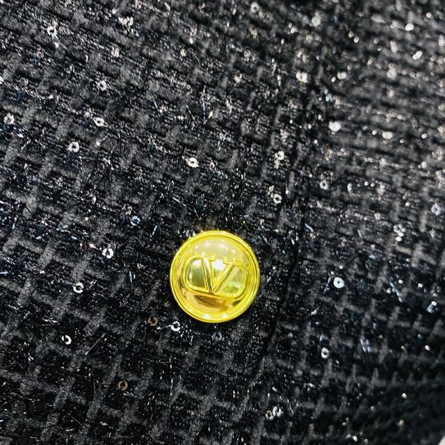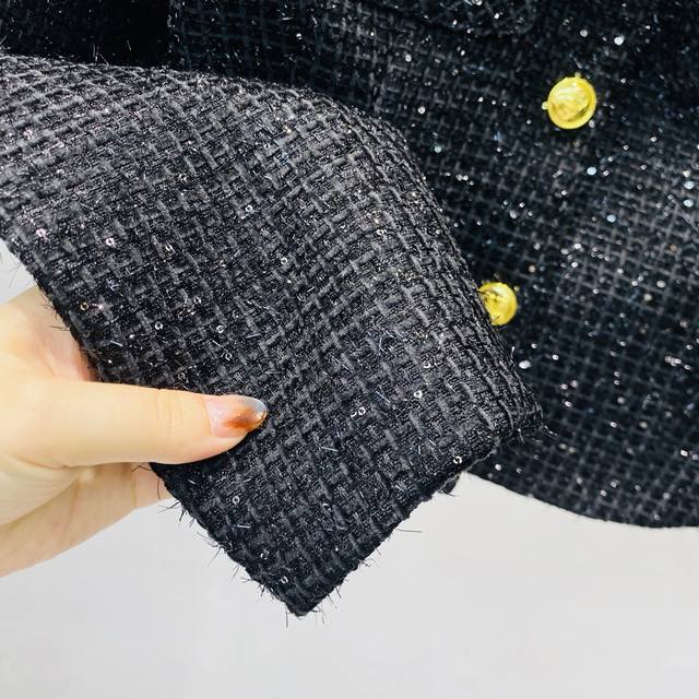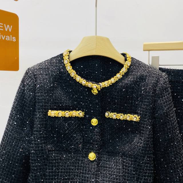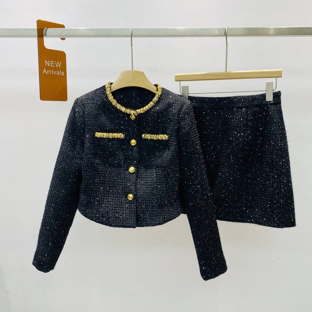 New High-End Studded Tweed Short Jacket Set with Heavy-Duty Gold Buttons and Glittering Skirt (Sizes: Smlxl,