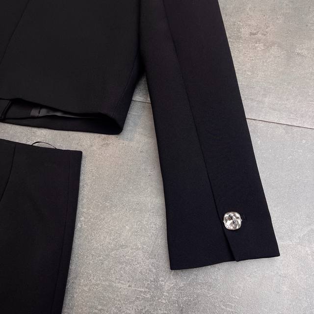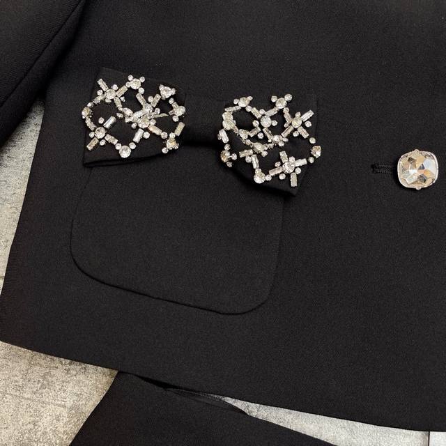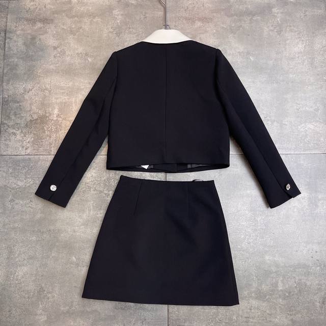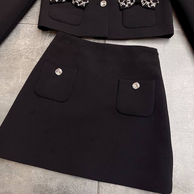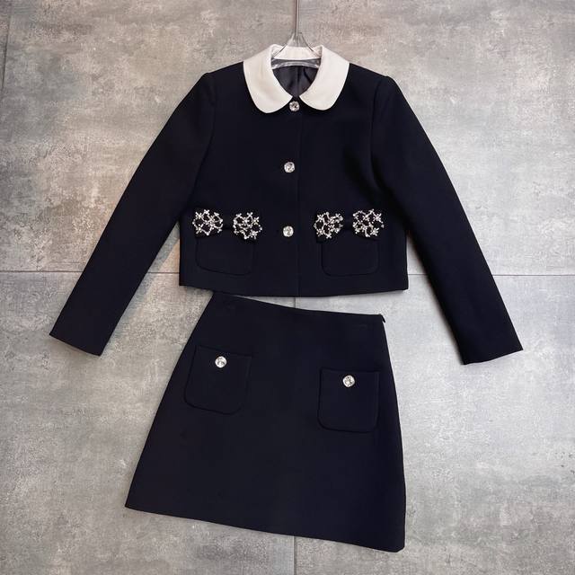 Hot-selling suit Mium*U 2025 early autumn new style, the chaebol daughter's age-reducing college style is playful yet elegant, a must-have item for little fairies, bow knot heavy beaded rhinestone doll collar contrasting splicing, original custom rhinestone button long-sleeved jacket + small A skirt