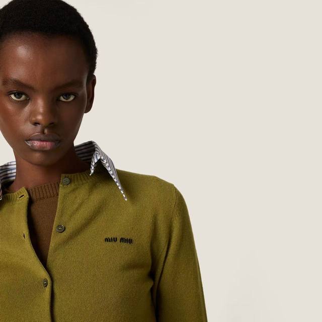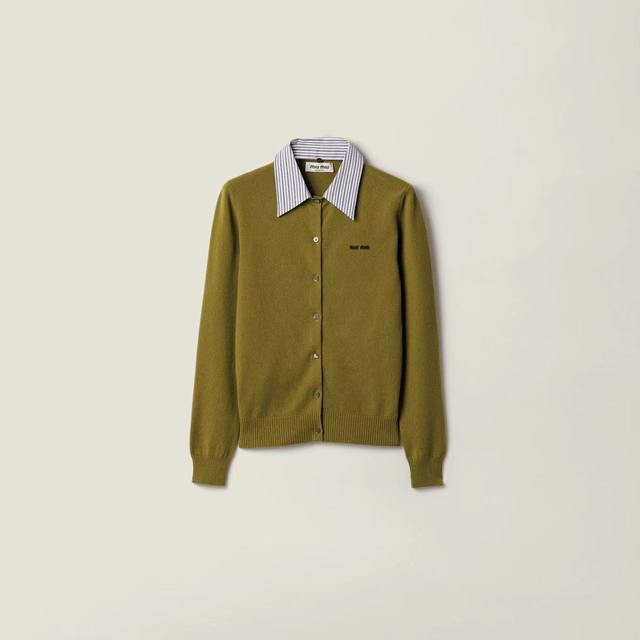 New Latest Miu 25New Detachable Striped Shirt Collar Cashmere Cardigan Color: Green Brown Size: Sml