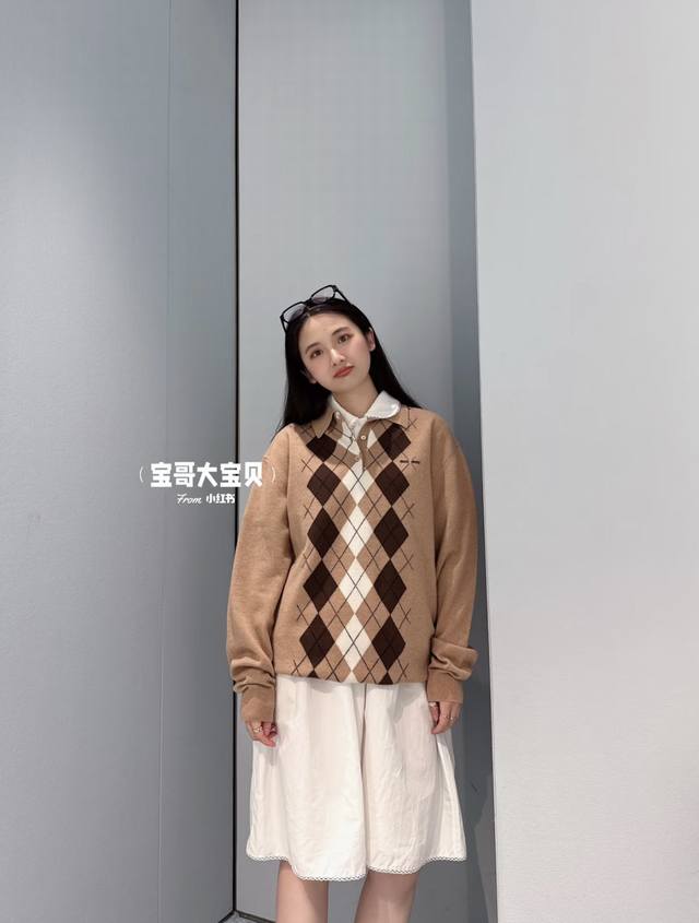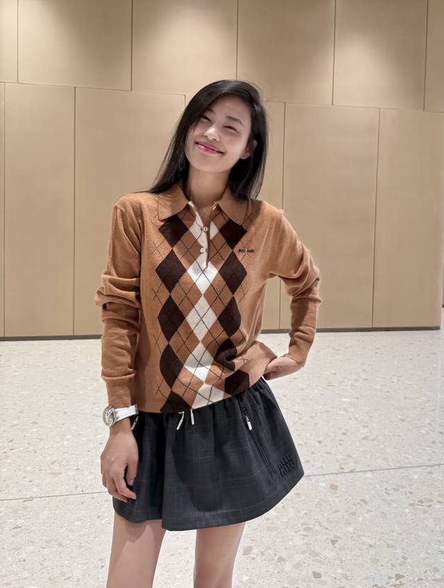 / New! Latest Miu 25New diamond pattern knit lapel polo top. Size: S, M, L, D, D,