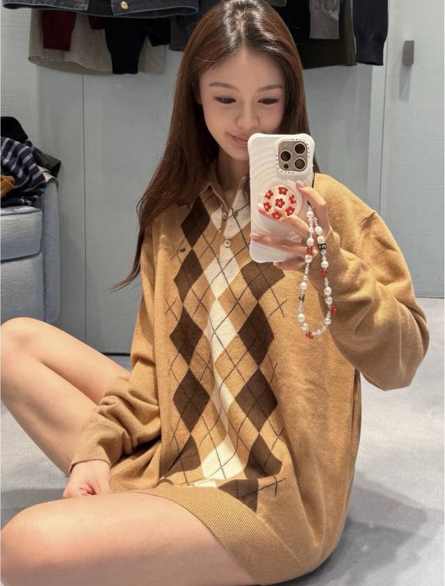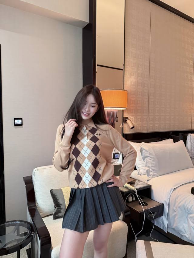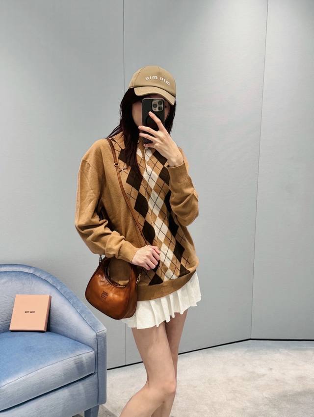 New! Latest Miu 25New diamond pattern knit lapel polo top. Size: S, M, L, D, D, D.