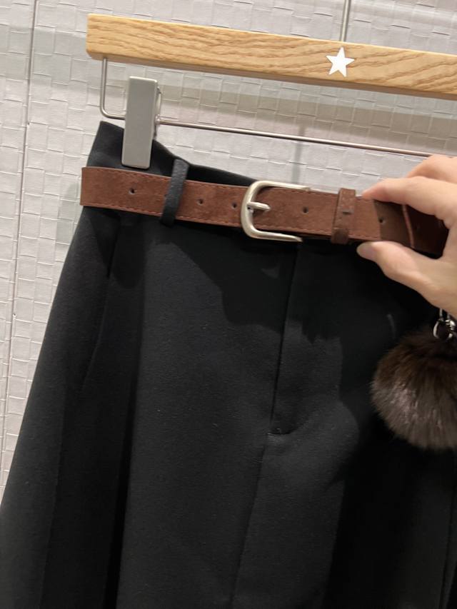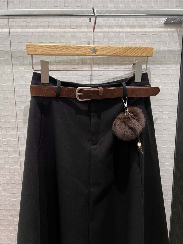 New minimalist A-line midi skirt with pom-pom belt, simple, casual, youthful, and versatile. Available in black, dark blue, and dark gray. Sizes: S-XL,