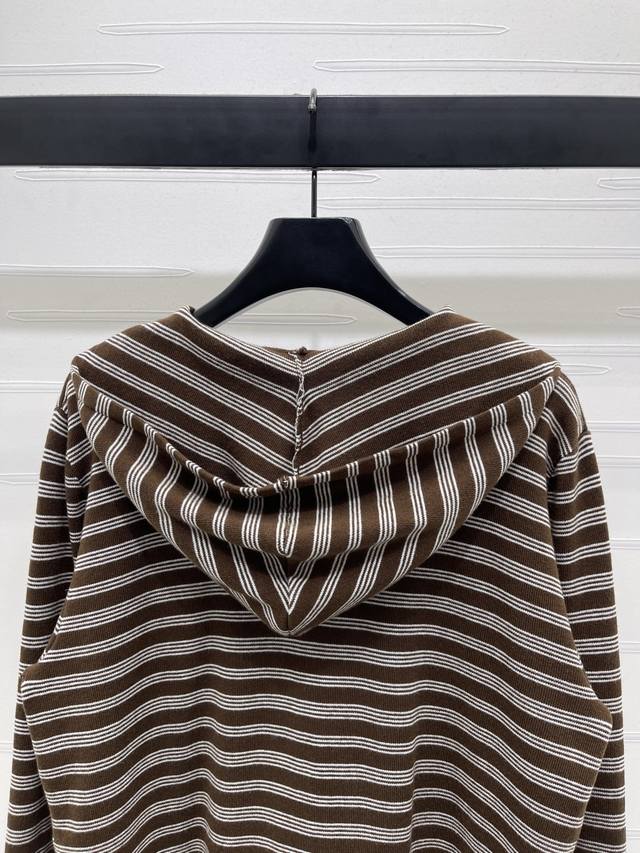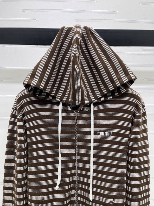 New, original, high-end Miumi* 2025 Early Fall Collection! Hooded, zip-up, knitted long-sleeved cardigan! Custom-woven YB silk-wool yarn for a refined, comfortable fit. The hooded, zip-up jacket is easy to wear alone or open for layering, adding versatility to any outfit. The allover, matching stripes interweave at the cuffs and hem, with solid-color binding, create a simple, casual look that adds a touch of style and personality. The wheat-like lettering on the chest creates a low-key, sophisticated feel. The overall look is relaxed and youthful, brimming with energy! One color! 3 sizes SM-L! High-quality, large-volume