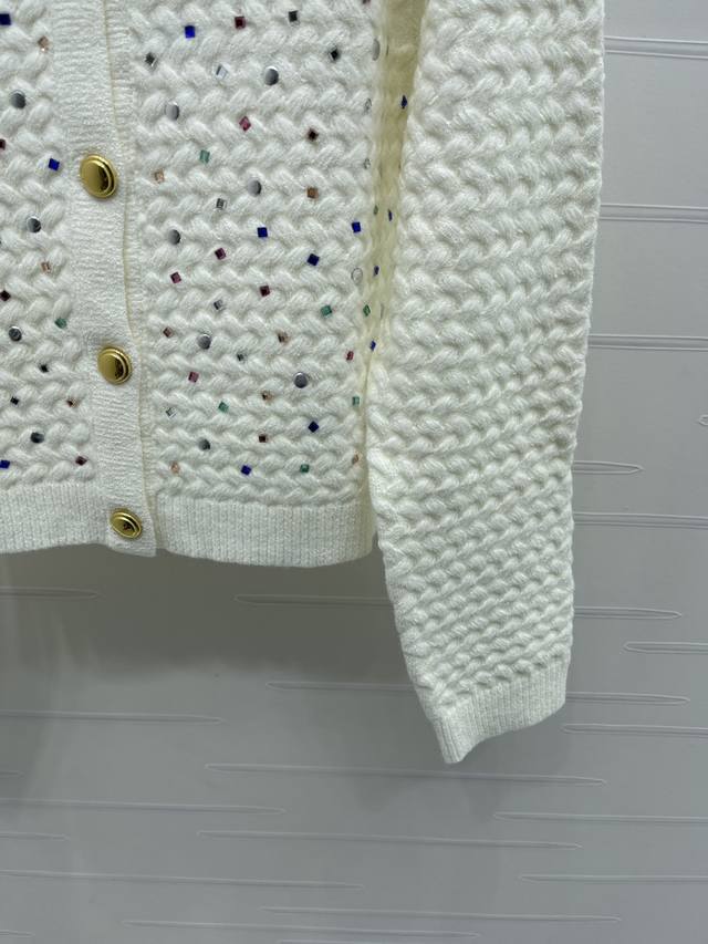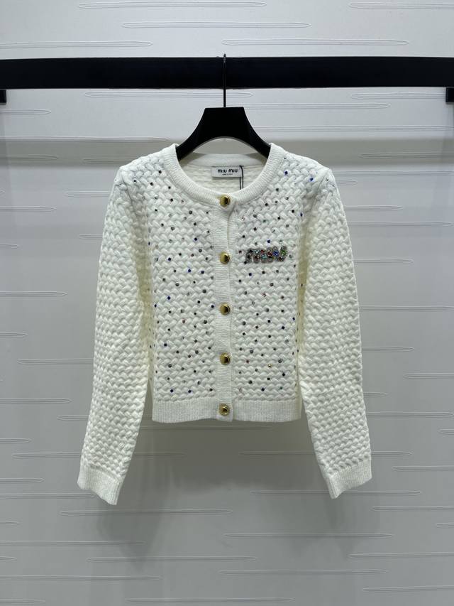 New, original, high-end Miumi* 2025 Early Fall Collection! Round-neck knitted cardigan with gemstones and rhinestones! Woven from custom wool yarn for a comfortable, stylish look. Round-neck, long-sleeved cardigan with a three-dimensional weave and dense stitching for exceptional windproofing and warmth. Creates a relaxed, gentle feel. Threaded hem and cuffs complement the chest logo with beading, highlighting the brand's stylish appeal. Regular fit, full of artistic academy flair, stylish accents, and a stylish, youthful look! Available in two colors! Sizes SM-L3! High-quality, bulky