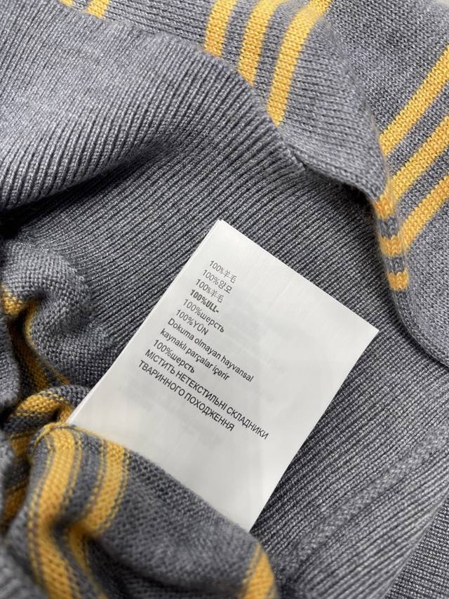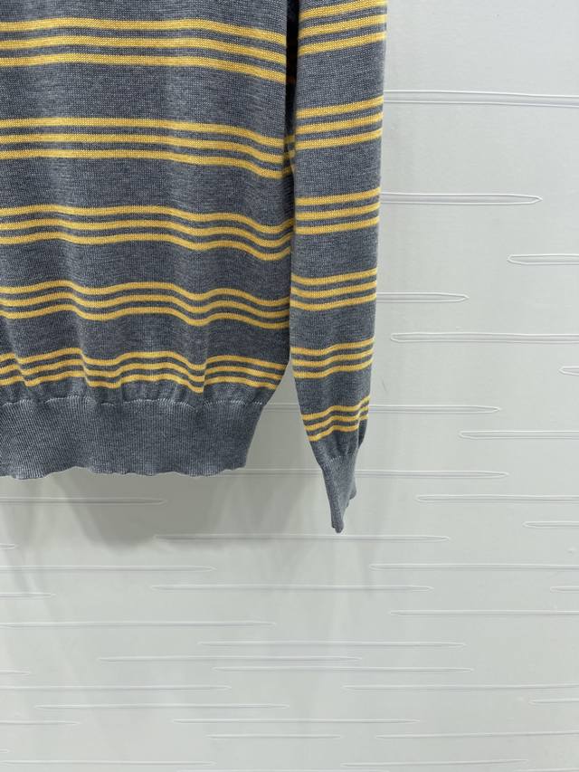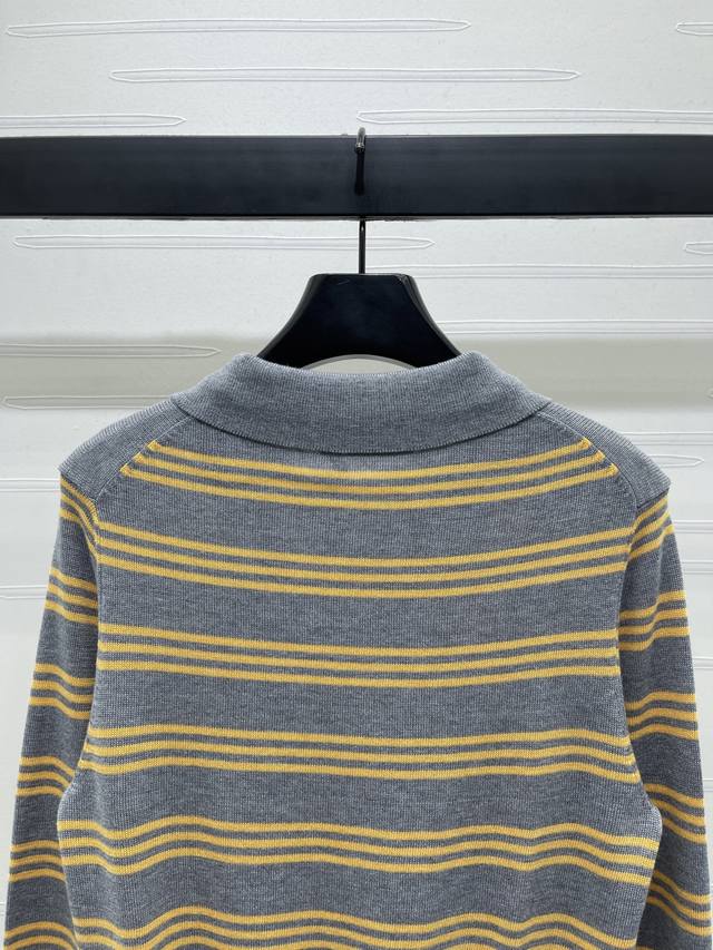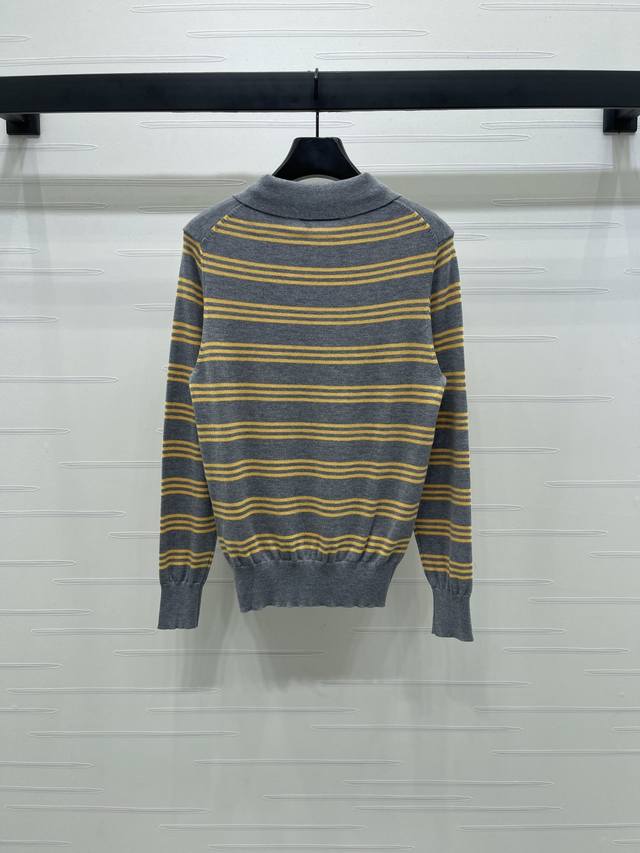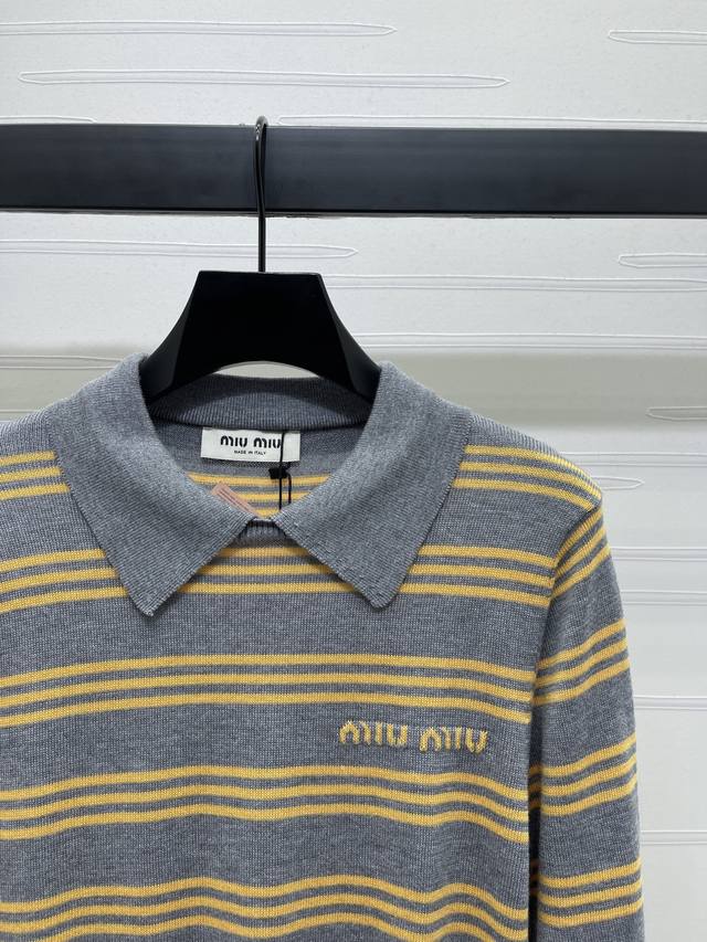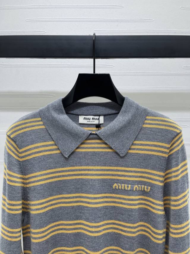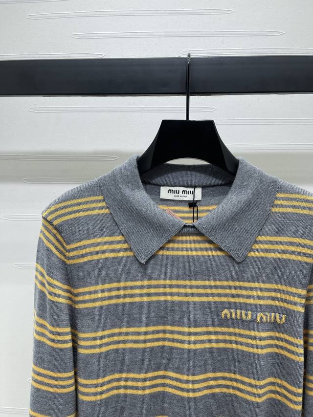 New, original, high-end Miumi* 2025 Early Fall Collection! Striped lapel knitted long-sleeved sweater! Custom-made imported knit material, comfortable and delicate, with a rich texture. Lapel long-sleeved top with a logo crochet logo on the chest. Contrasting stripes and a regular fit create a slimming effect, showcasing a youthful look. Easy to wear for everyday commuting! Available in two colors! Sizes SM-L3! High-quality, bulky stock A706B300C