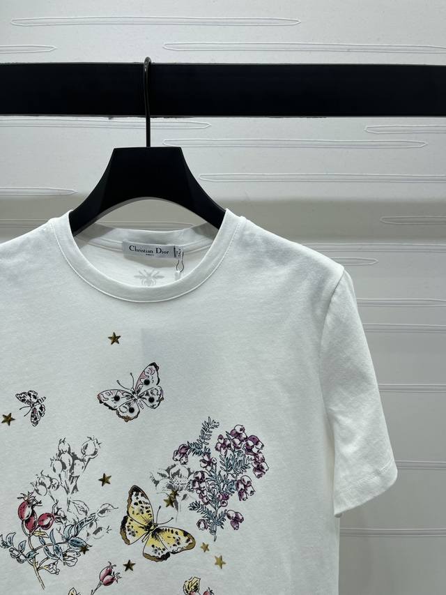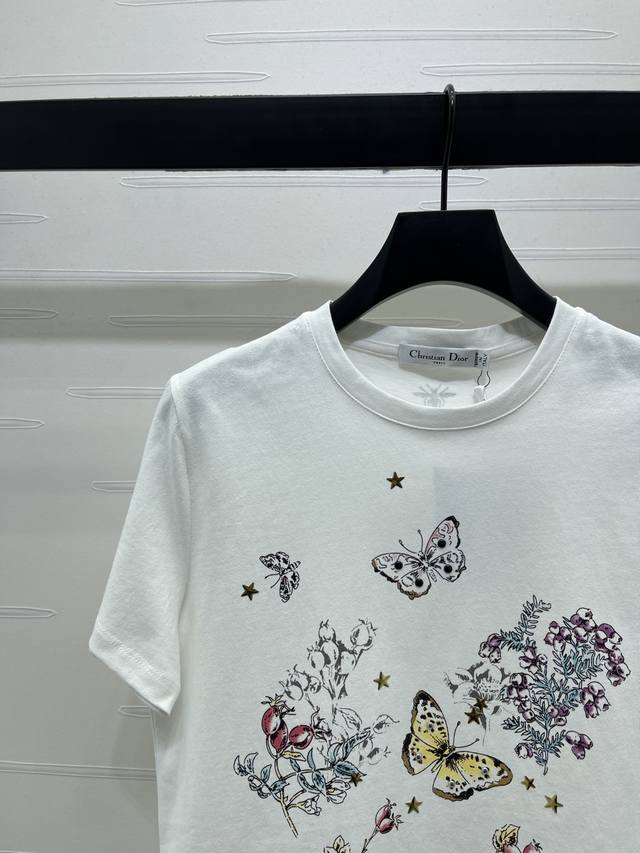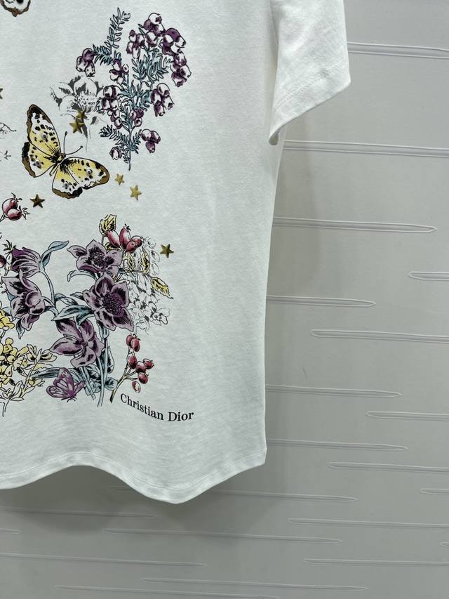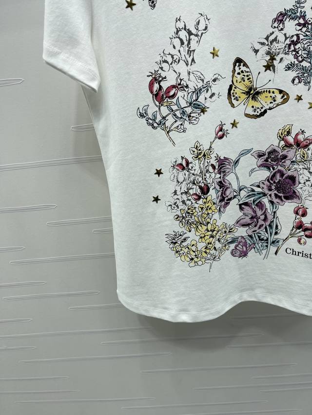 New, original, high-end quality, Dio* 2025 Early Fall collection! Round neck printed short-sleeved T-shirt! Custom-made, 100% cotton material, breathable, comfortable, and full of texture. Round neck, regular short-sleeved T-shirt, cut to highlight the brand's style. Made of heavyweight cotton with a slight stretch for a slimming effect. Colorful flowers and butterflies on the chest exude a spring-like atmosphere. The hem is interspersed with letter logos in an artistic style, creating a playful and fashionable feel. The vibrant color combination creates a personalized style. It's playful and age-reducing. It looks stylish worn alone or as an inner layer! 1 color! Sizes SM-L3! High-quality, large-volume
