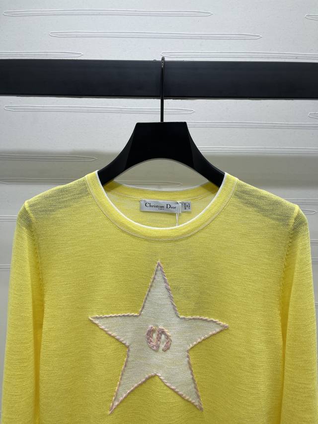 New, original, high-end quality, Dio* 2025 Early Fall collection! Star-shaped knitted long sleeves! Custom-woven silk and wool yarn for a premium, comfortable, and soft look. Round neckline, long sleeves, contrasting ribbed hem, chest weaving technique, five-pointed star pattern on the outer frame, and Cd lettering on the inner circle highlight the brand's signature. Regular fit, concealing flesh and showing tenderness, perfect for everyday spring and summer wear with a youthful, youthful feel! 3 colors! Sizes SM-L3! High-quality, bulky stock A706B370C