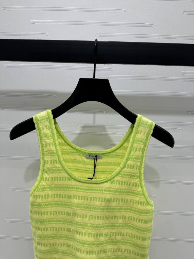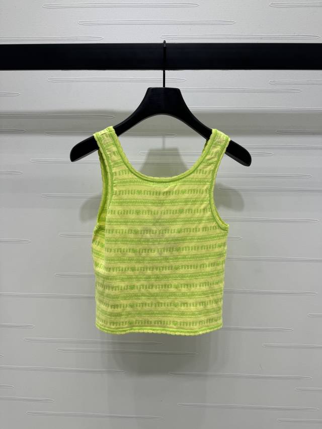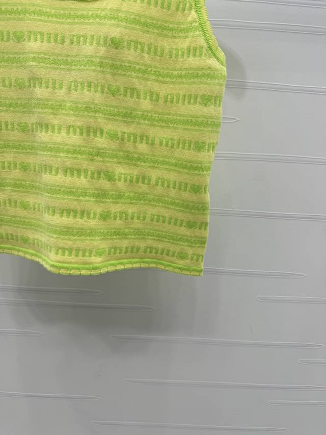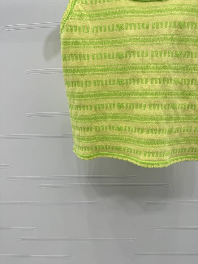 New original high-end quality Miumi*2025 spring and summer latest series! Striped knitted vest! Custom wool yarn weaving comfortable soft elastic knitted vest tailoring collar cuffs hem thread fine hem elastic tightening fit more concealing body shape contrast stripes with letter logo design details more high street fashion atmosphere ready-made clothing uses dense weaving technology delicate texture to add exquisite sense to simple wear easily show playful girl style slim fit slim and fashionable! 3 colors! SM-L3 size! High quality bulk A706B260C