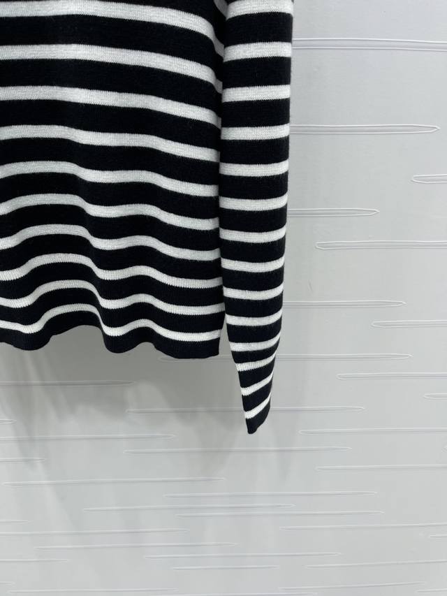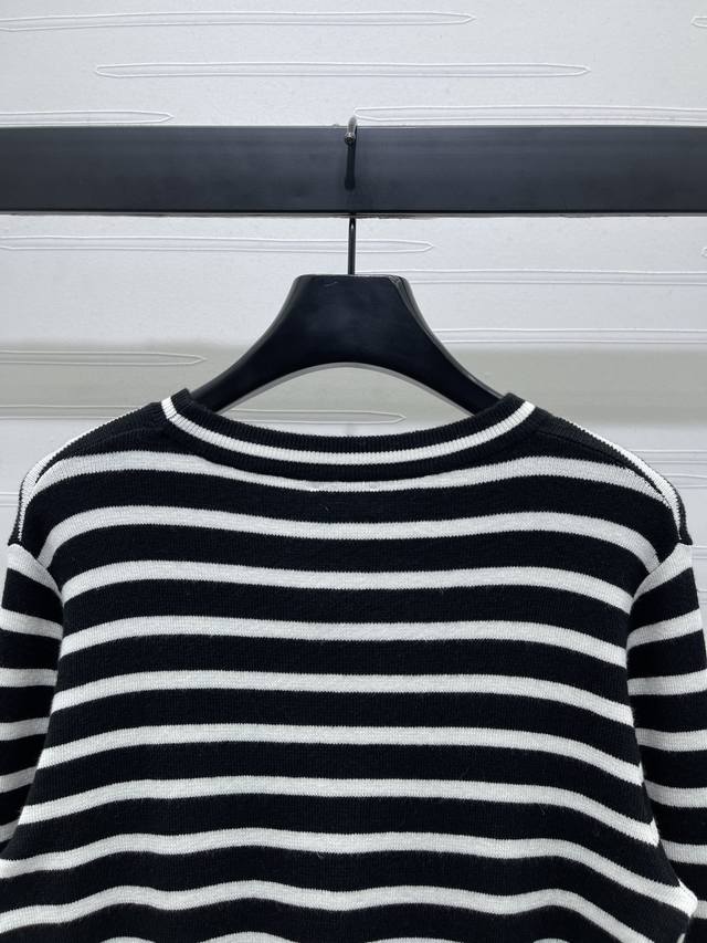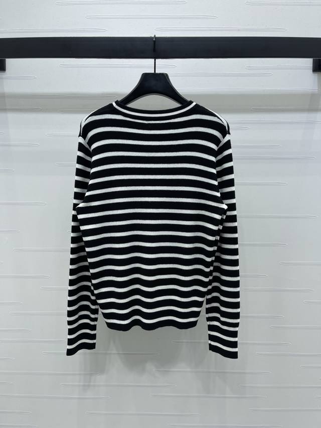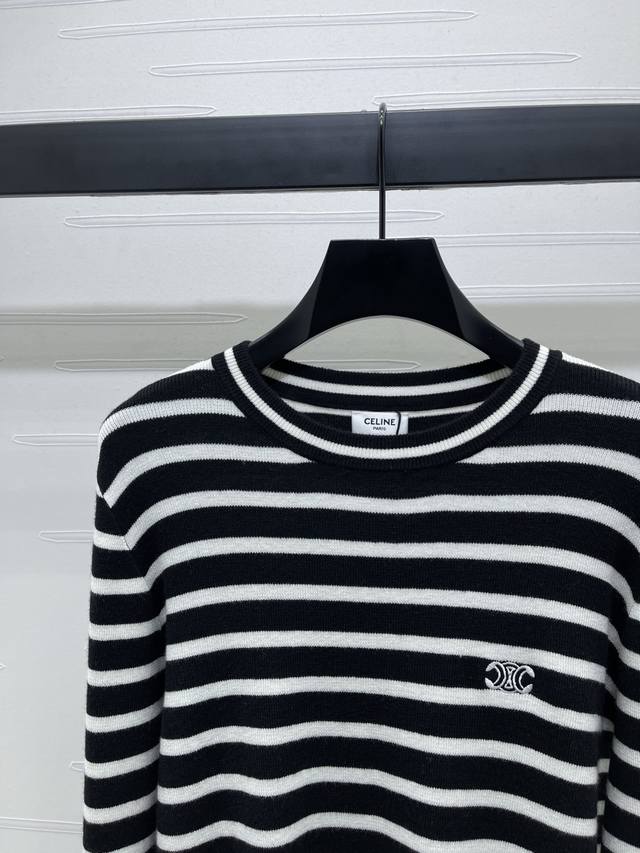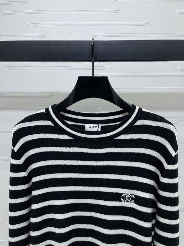 New, original, high-quality Celin* 2025 Early Fall collection! Striped knit long-sleeve top! Woven from custom wool yarn, fixed color and dyed for a perfect finish. Soft, comfortable, and stylish, with a noticeable plush feel for added weight. Long-sleeved pullover top with striped hems that flow in a different direction from the main body, creating a layered effect. Interwoven stripes throughout, with the Arc de Triomphe logo embroidered on the chest, creating a strong retro feel. Regular fit, versatile and playful, it's youthful and brightens your skin. Easily wearable for everyday travel or casual gatherings! Available in 2 colors! Sizes SM-L3! High-quality, bulky stock A706B310C