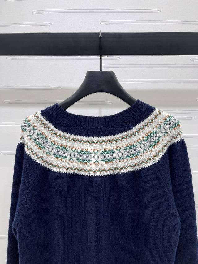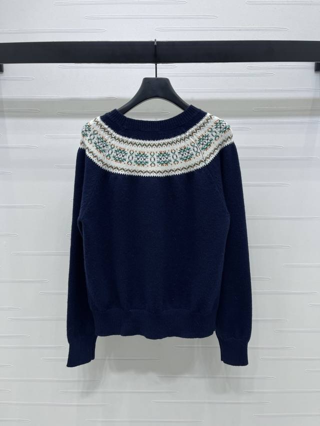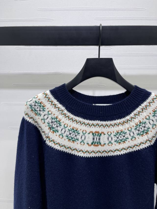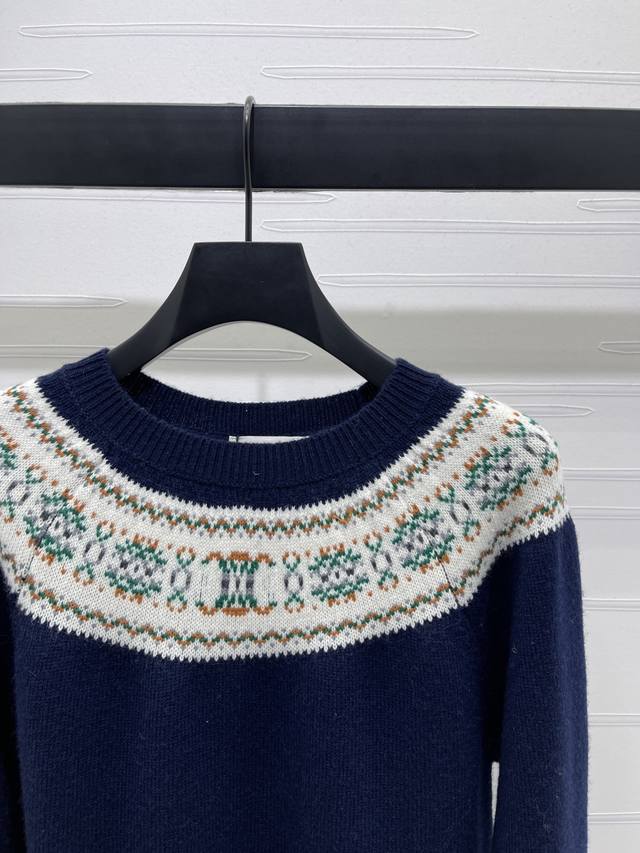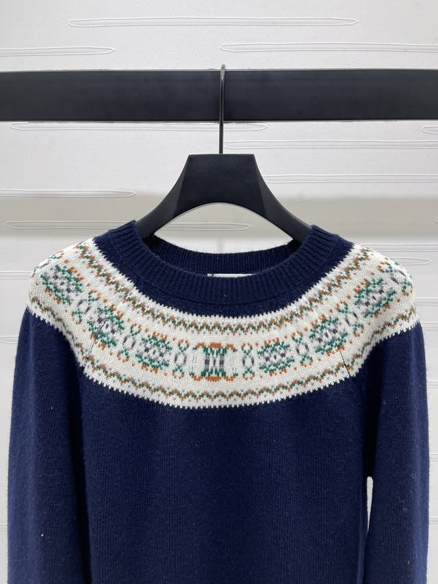 New, original, high-quality Celin* 2025 Early Fall collection! This heavy-crocheted crewneck pullover sweater is made from custom cashmere and wool knit for a premium, comfortable, and soft feel. The round neck and long sleeves feature ribbed hems that match the hem, and a Fair Isle-style crochet pattern around the neck for a youthful, artistic vibe. The Arc de Triomphe jacquard logo is centered to highlight the brand's identity. The cashmere knit fabric is warm and comfortable, and the regular fit makes it a versatile and simple everyday style for fall and winter! Available in two colors! Sizes SM-L3! High-quality, large-volume stock. A706B350C