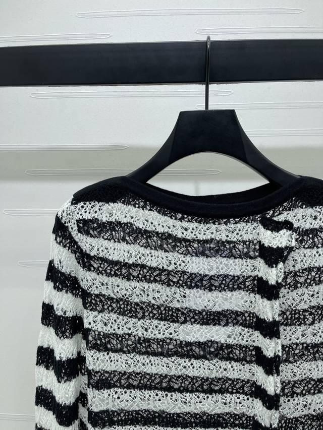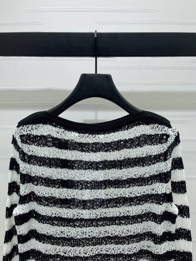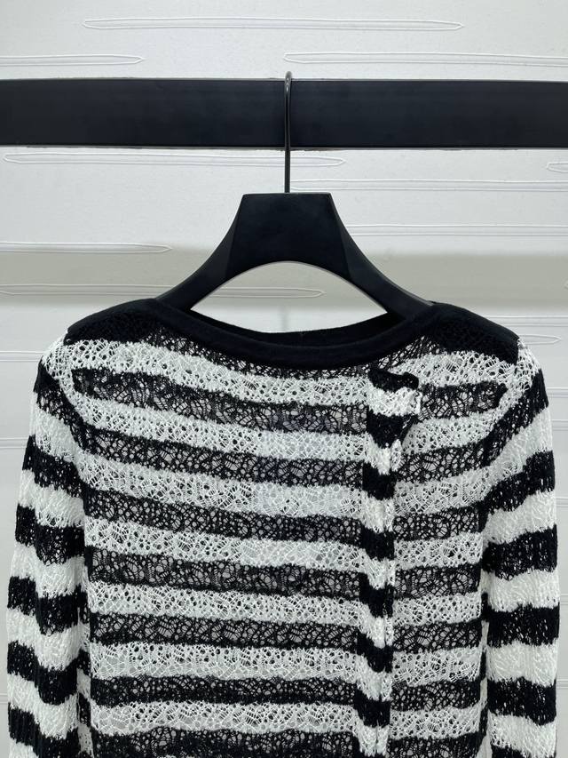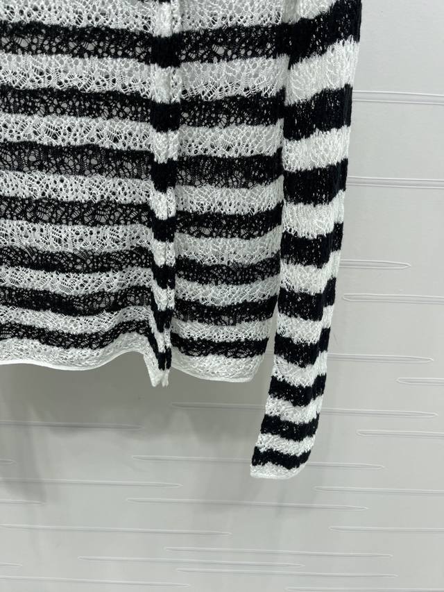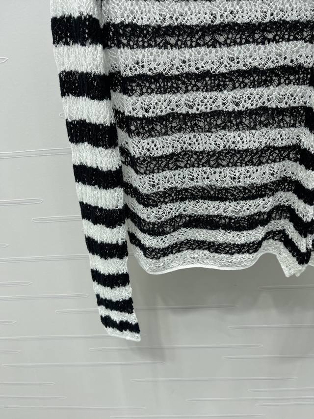 New, original, high-quality Dio* 2025 Early Fall collection! Off-the-shoulder, hollowed-out, striped knit long-sleeve top! Custom-woven from imported wool yarn, this top is delicately textured, soft and comfortable. The off-the-shoulder, striped long-sleeve design perfectly highlights the charming collarbone and elegant neckline. The all-over black and white striped crocheted design showcases the brand's unique style and personality! One color! 3 sizes SM-L! High-quality, bulk stock A706B340C