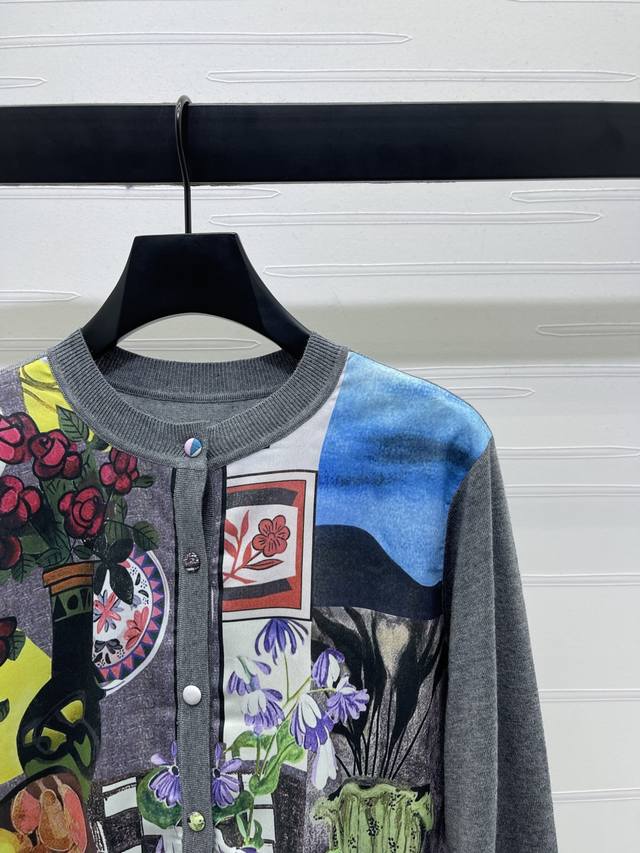 New, original, high-quality, Erdos* 2025 Early Fall collection! Printed, knitted, round-neck, long-sleeved cardigan! Custom-woven wool yarn for a premium, comfortable, soft, dense, and delicate knit that highlights the brand's signature silhouette. The round-neck, long-sleeved cardigan features an artistic collage pattern on the front, contrasting colors, and buttoned buttons to create the brand's unique artistic image. The threaded hem at the neckline and cuffs matches the hem, creating a stretchy, comfortable, and elegant look. Available in one color! Sizes SM-L3! High-quality, bulk stock A706B360C