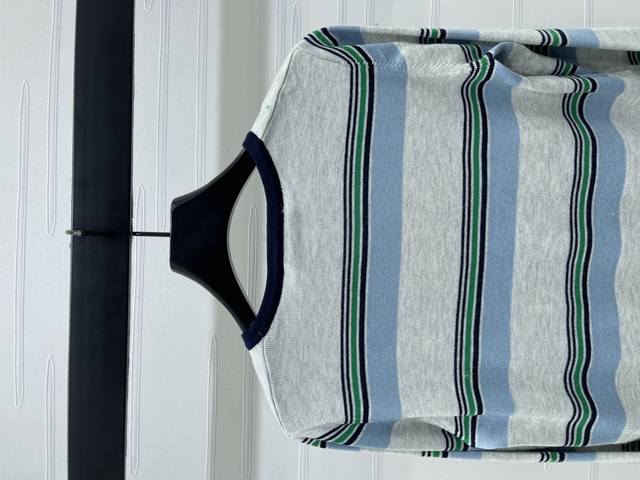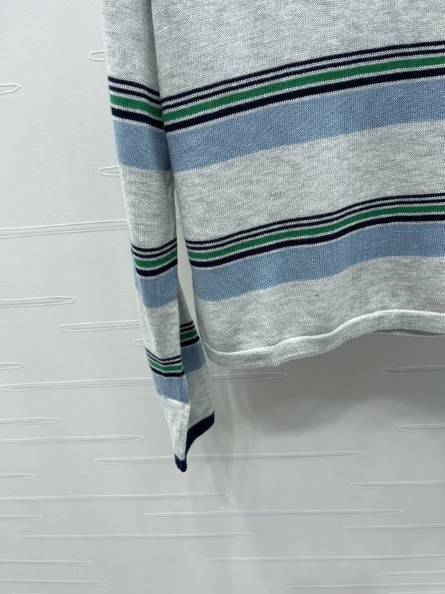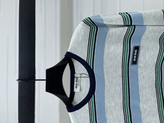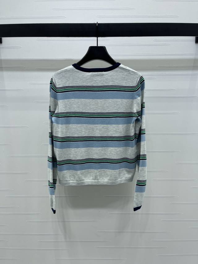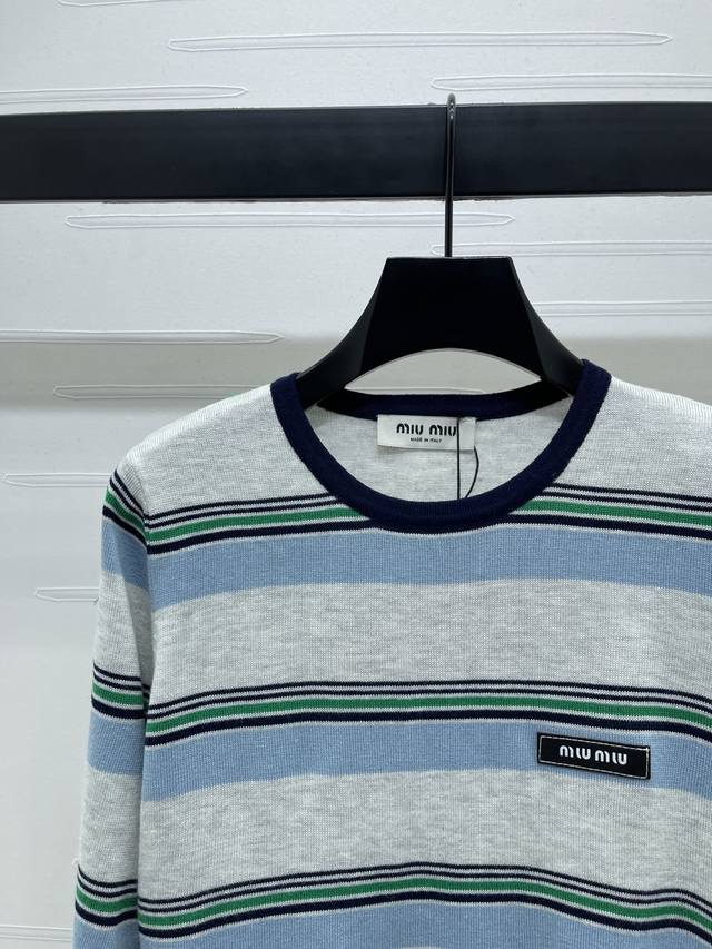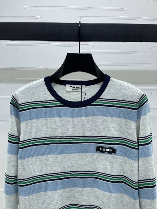 New, original, high-quality, Miumi* 2025 Early Fall collection! Crew-neck knitted striped long-sleeve top! Custom nylon and wool knit material, comfortable, breathable, and stretchy. Round neck and long sleeves, leather logo detail on chest, multiple pinstripe contrasting colors for a youthful, preppy look. Regular fit, flattering and slimming, pairs well with jeans or skirts! Available in one color! Sizes SM-L3! High-quality, bulky stock A706B320C