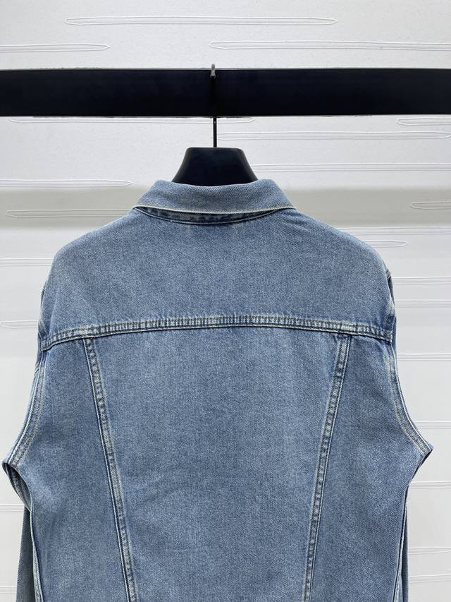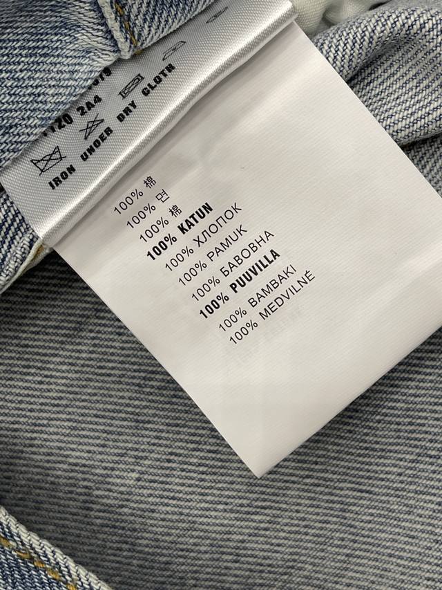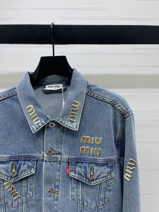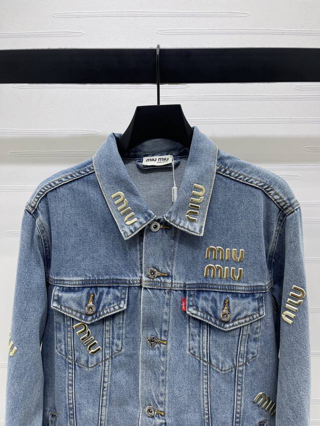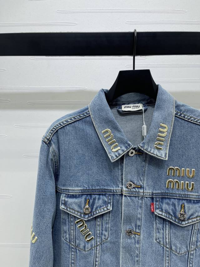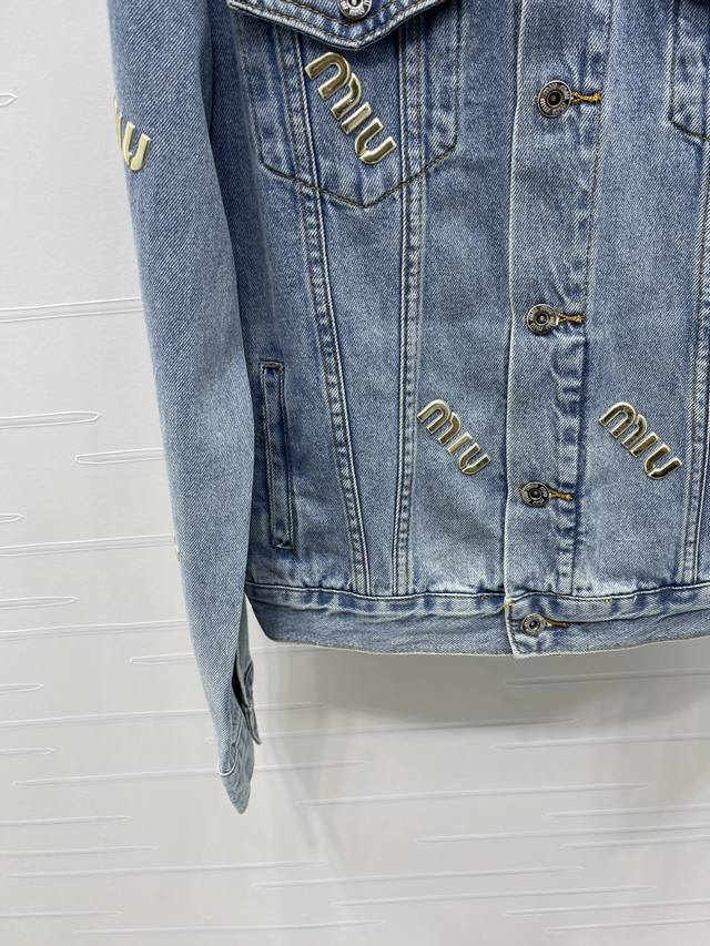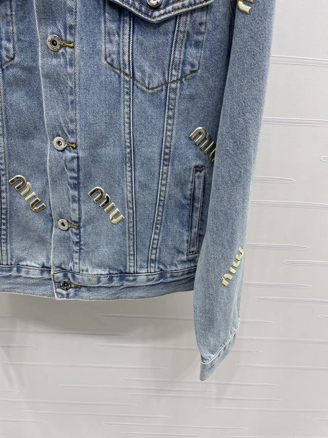New, original, high-quality, Miumi* 2025 Early Fall collection! Denim jacket! Custom-made cotton twill denim for a sleek, wide texture. Repeated enzyme washing process for a tailored silhouette. A must-have for early fall. Light washed blue, stylish and stylish. Three-dimensional gold lettering embellished throughout, with engraved buttons. A premium retro-inspired, regular denim jacket with a sleek, trendy fit. Available in one color! Sizes SM-L3! High-quality, bulky stock. A706B530C