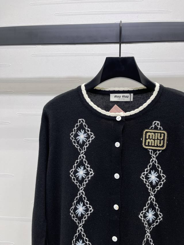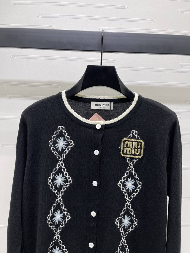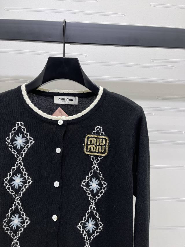 New, original, high-quality, Miumi* 2025 Early Fall collection! Diamond-patterned knitted long-sleeved cardigan! Woven from custom wool yarn for a delicate, soft and comfortable texture. Round neck, long-sleeved knitted cardigan with delicate, soft hemming at the neckline and cuffs. Symmetrical diamond pattern on the chest, contrasting lace trim, and preppy style add a youthful touch. Embroidered lettering and logo accents highlight the brand's artistic style, showcasing the British style. A must-have for dates and commuting! Available in two colors! Sizes SM-L3! High-quality, large-volume stock (