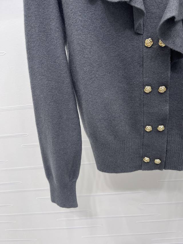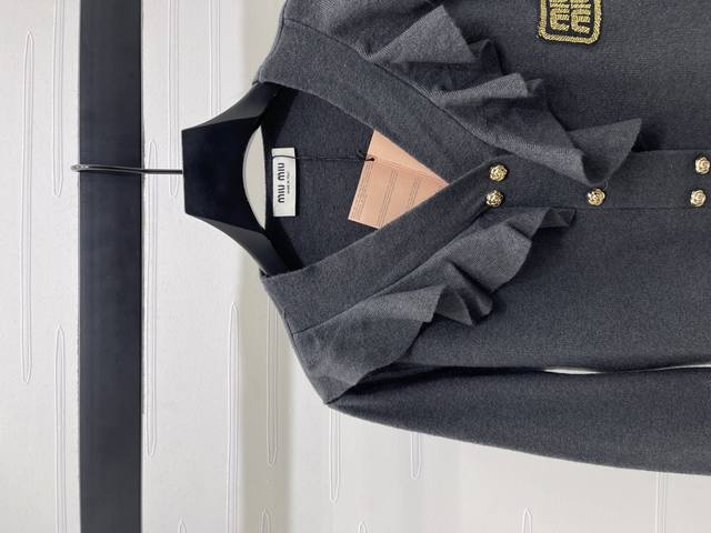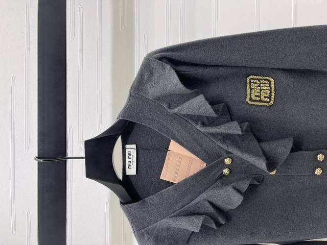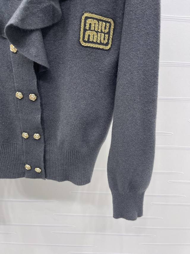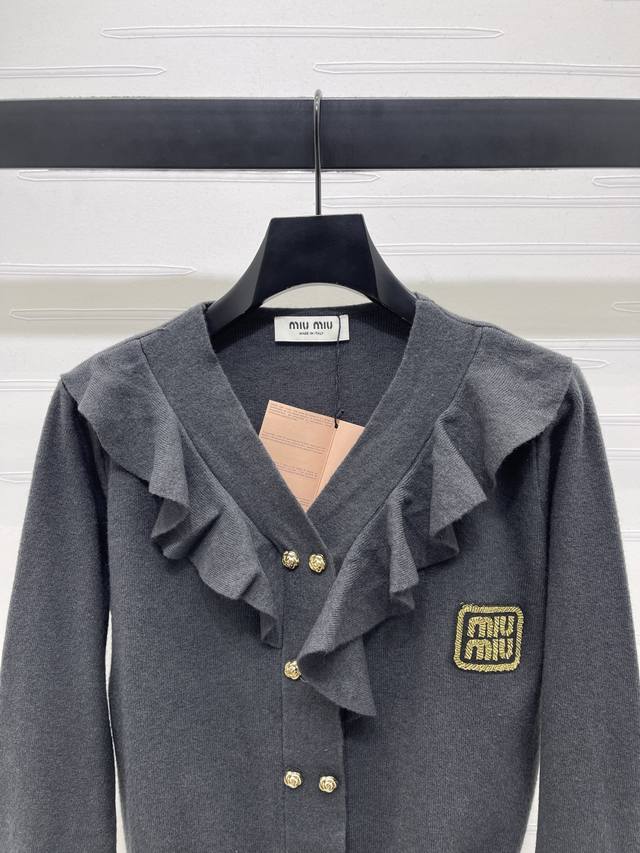 New, original, high-quality, Miumi* 2025 Early Fall collection! Ruffled V-neck long-sleeved cardigan! Custom-woven wool yarn, premium ruffled knit top with a double-breasted front and ruffled lace trims for a flattering neckline. The detailed, textured wheat-like logo on the chest highlights the brand's style, creating a sweet, youthful, and collegiate look! Available in two colors! Sizes SM-L3! High-quality, bulky stock A706B330C