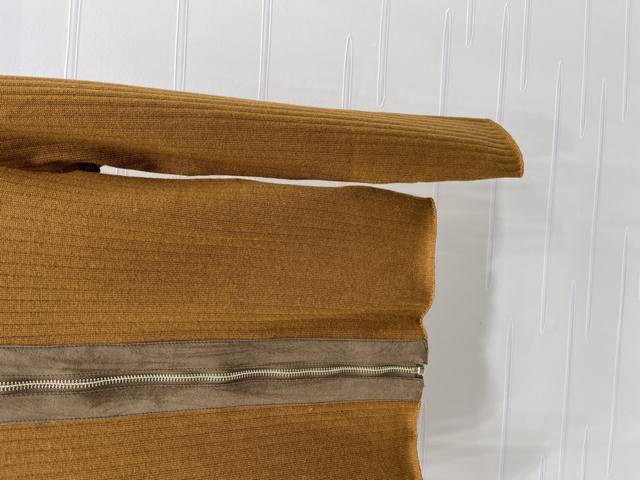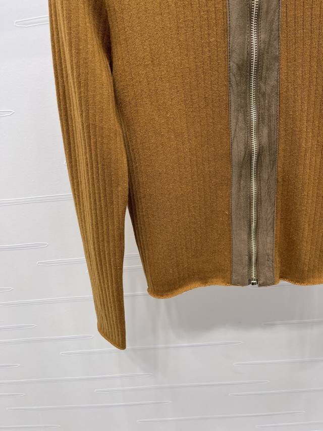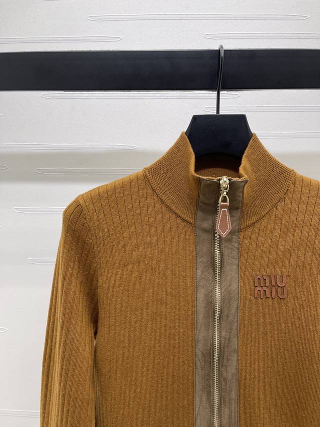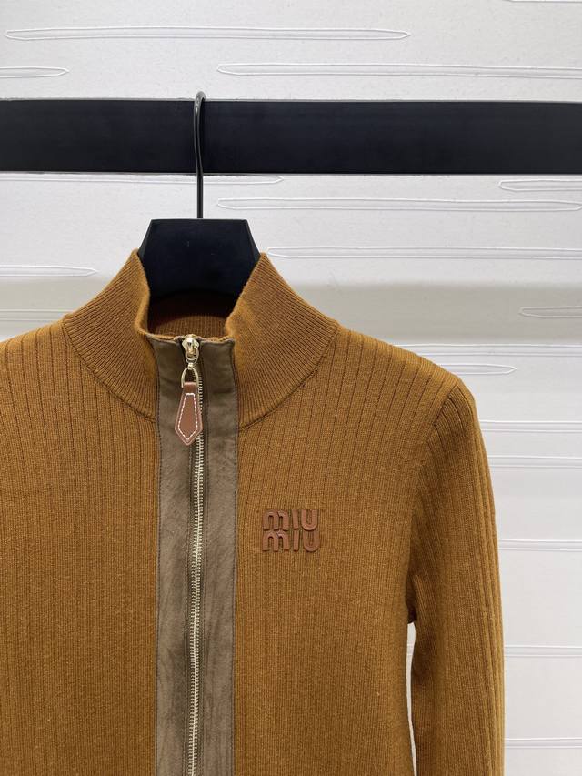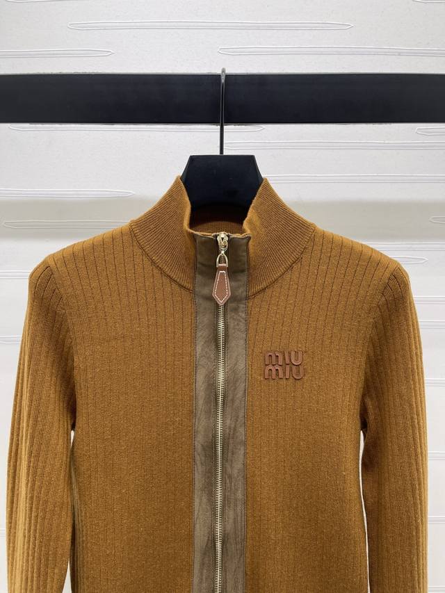 New, original, high-quality, Miumi* 2025 Early Fall collection! This leather-trimmed knitted cardigan! Custom-woven wool yarn for a premium, stretchy, and comfortable look. A high-collar, zippered cardigan enhances the head-to-shoulder ratio and creates a slimming effect. A signature logo appears on the chest, and vertical stripes throughout create a slimming effect. The suede-trimmed zipper creates a retro, preppy look. The stretchy, regular fit makes it a great choice for everyday travel or gatherings! Available in 3 colors! Sizes SM-L3! High-quality, bulky stock A706B330C
