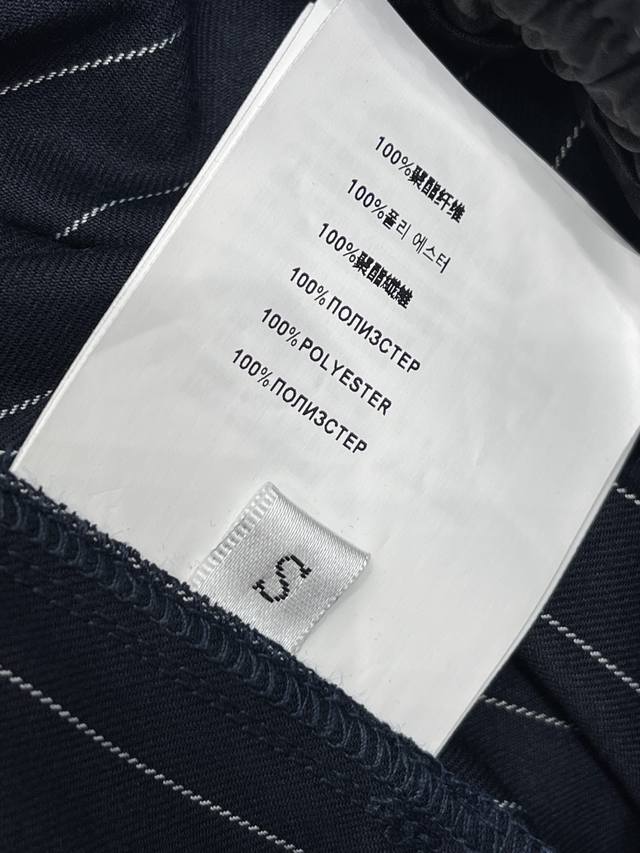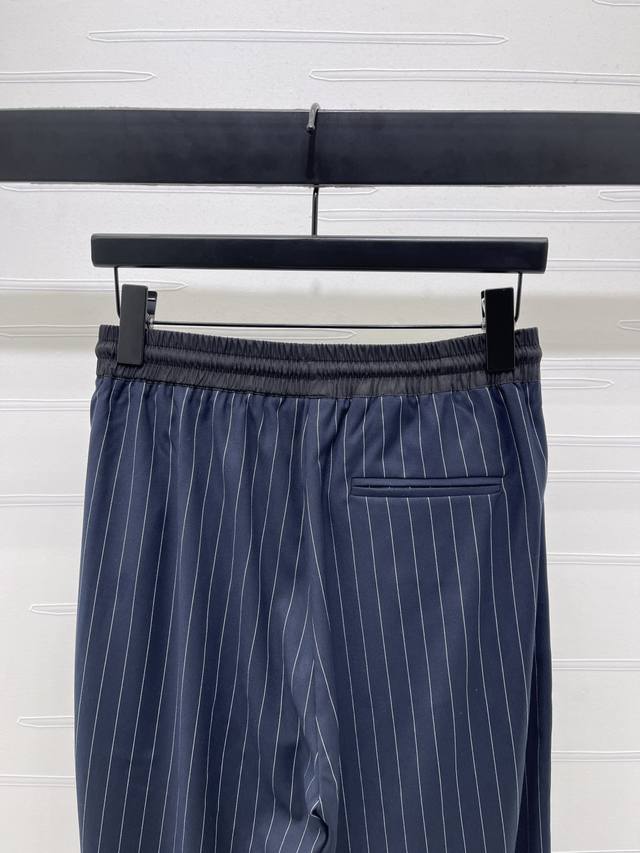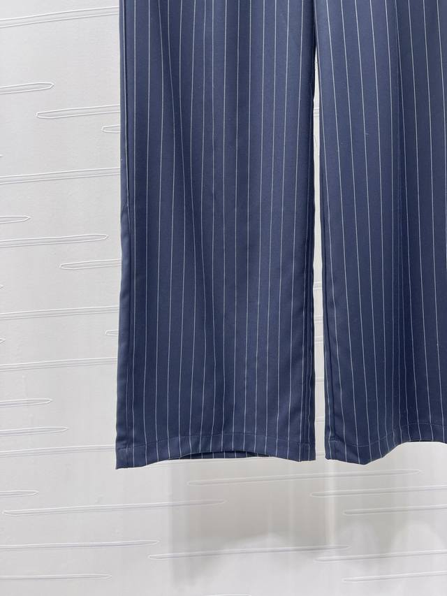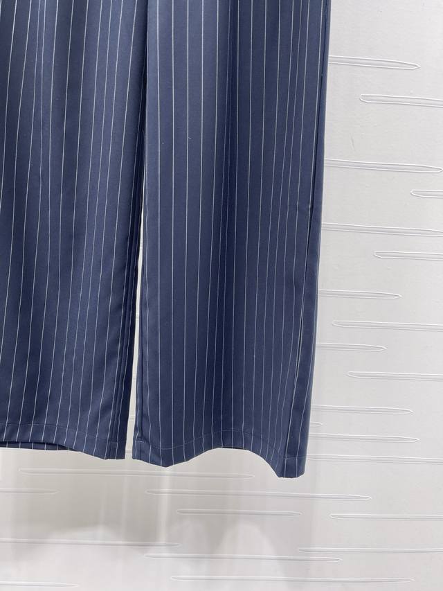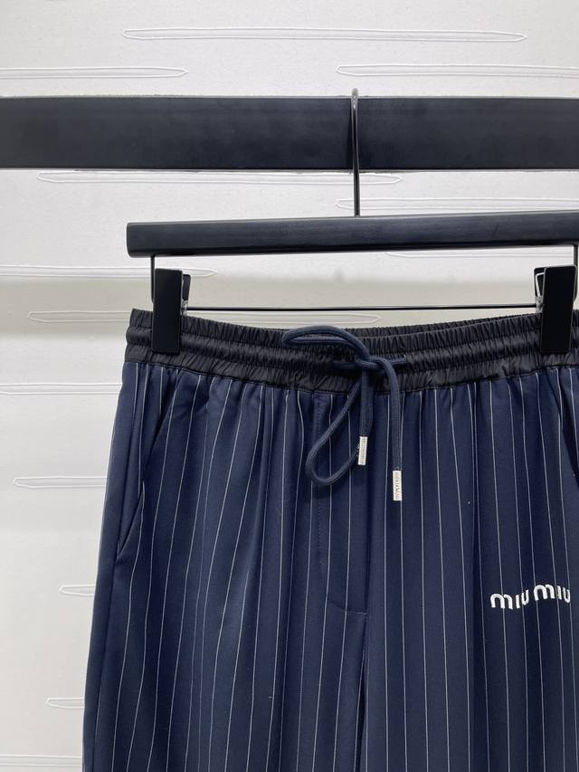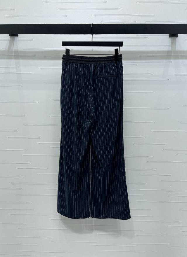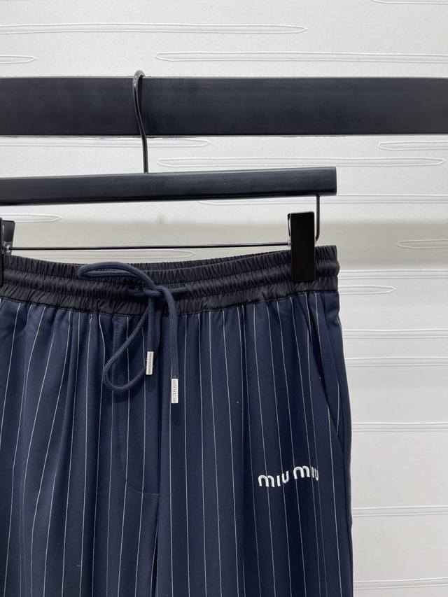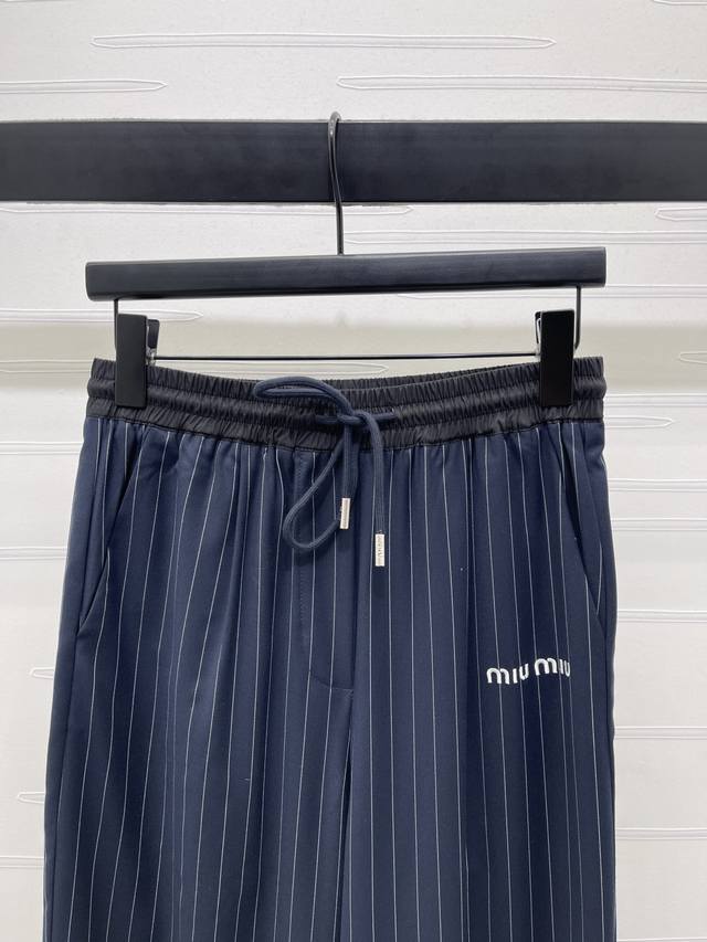 New, original, high-quality Miumi* 2025 Early Fall collection! Vertical striped elastic waist casual trousers! Custom-made imported twill cotton material with a lustrous texture and enhanced drape. Premium elastic waist straight-leg trousers with vertical stripes and embroidered letter logos on the diagonal edges enhance the brand's style. Suitable for all body types, the relaxed fit can be paired with a suit jacket from the same series for a youthful and stylish look! 1 color! Sizes SM-L3! High-quality, bulky stock A706B440C