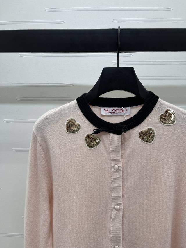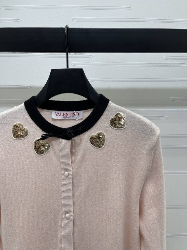 New, original, high-quality, Valentin* 2025 Early Fall collection! Contrast sequined heart-shaped knitted long-sleeved cardigan! Woven from custom wool yarn, this soft and comfortable round-neck cardigan is cut for a relaxed, figure-flattering silhouette. The neckline is accented with plain black binding, and the sequined heart pattern surrounding the neckline echoes the brand's positioning, adding an elegant touch to the minimalist style and highlighting the brand's tonality. The color combination exudes a retro vibe. A must-have for dating and commuting! One color! 3 sizes SM-L! High-quality, bulky stock A706B370C