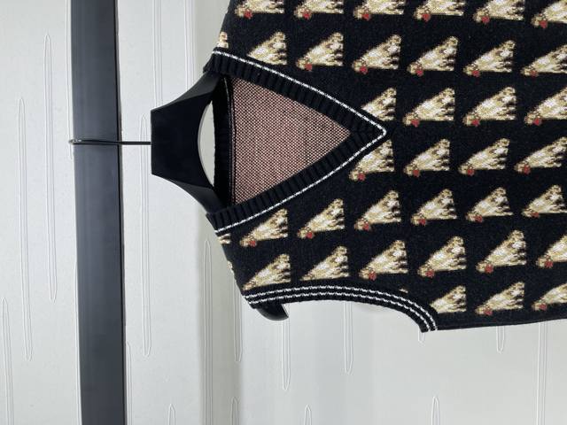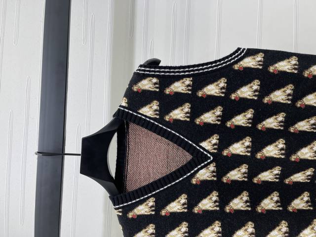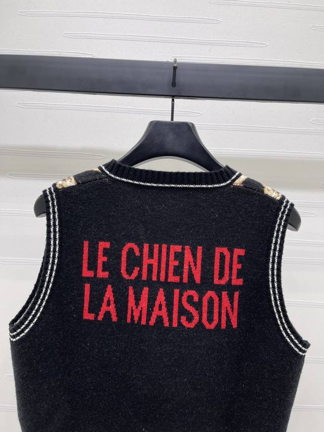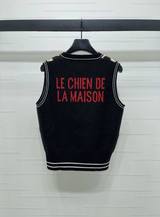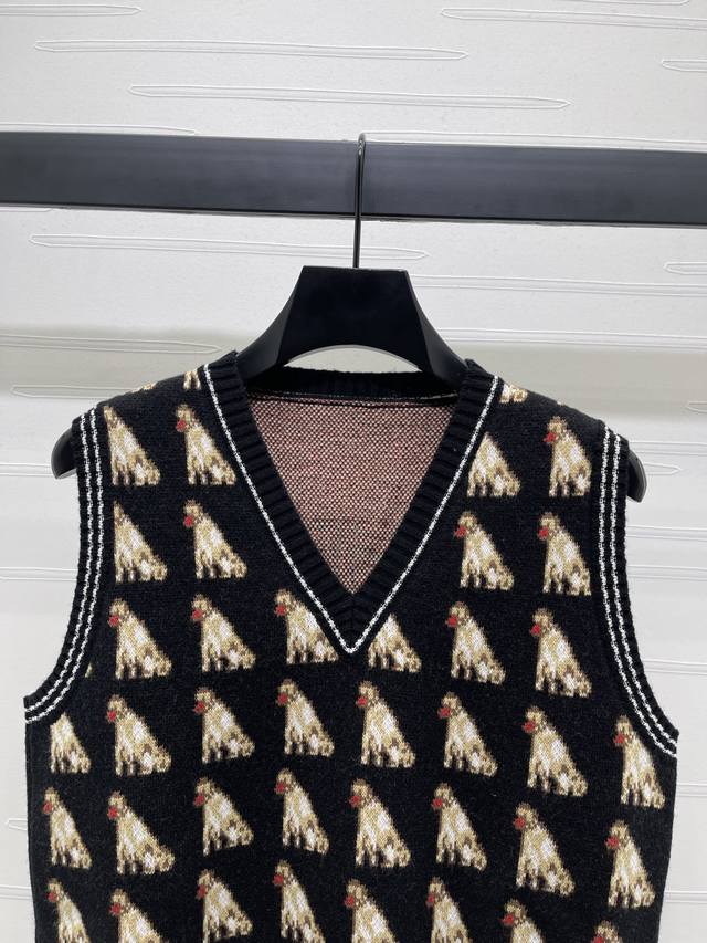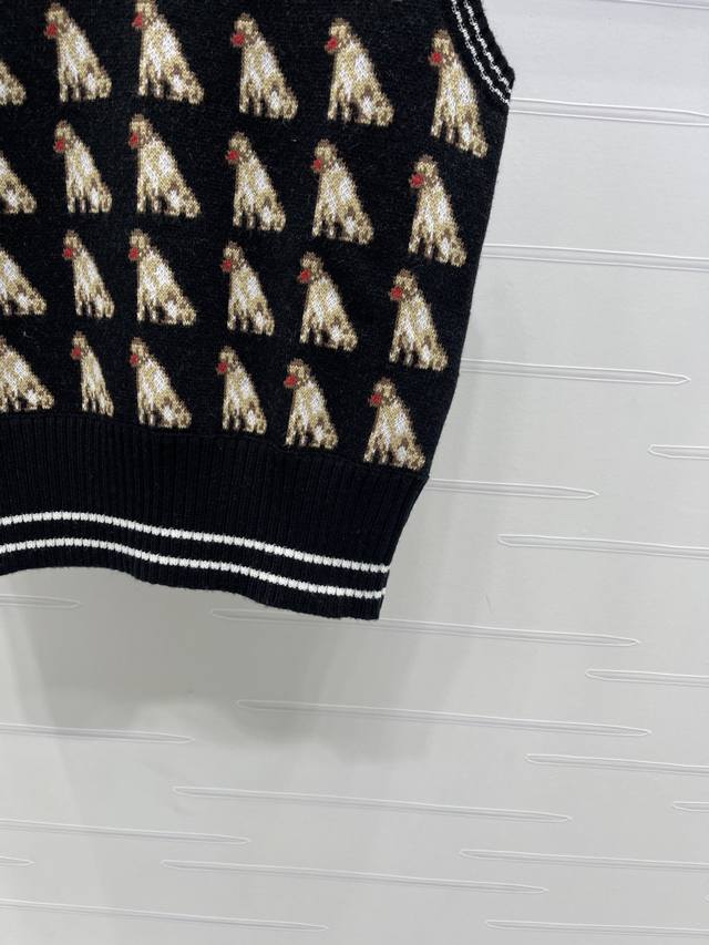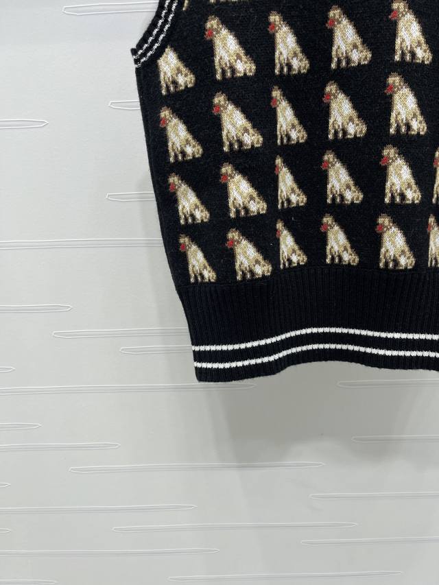 New, original, high-quality Valentin* 2025 Early Fall collection! Knitted vest with puppy motif, synced with the official website! Custom-made imported wool knit, soft, comfortable, and textured. V-neck knitted vest with a black base, off-white crocheted puppy motif on the neckline and hem, accented with black and white striped borders. A super slimming, sweet, and cool piece for a youthful look! Available in one color! Sizes SM-L3! High-quality, large-volume stock